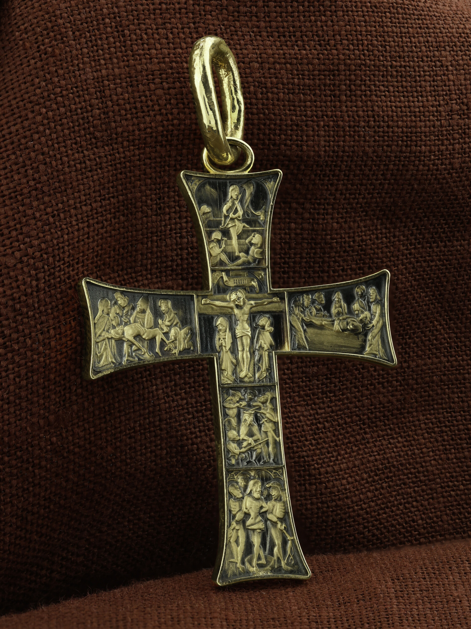 На лицевой стороне креста изображены Крестные Страдания и Воскресение Господа и Спасителя нашего Иисуса Христа. Крест- символ спасения и искупления рода человеческого, знамение победы над смертью и адом. Иисус Христос, как искупительная жертва освобождения человечества от власти греха, умер крестной смертью и в третий день воскрес. В центре креста изображено Распятие Иисуса Христа на Кресте. Ниже — взятие под стражу, а также пытки и мучения Христа перед Распятием. Слева от Распятия изображено снятие Господа с Креста, справа — положение во гроб. Над Распятием отображен образ Воскресшего из гроба Господа и Спасителя нашего Иисуса Христа.