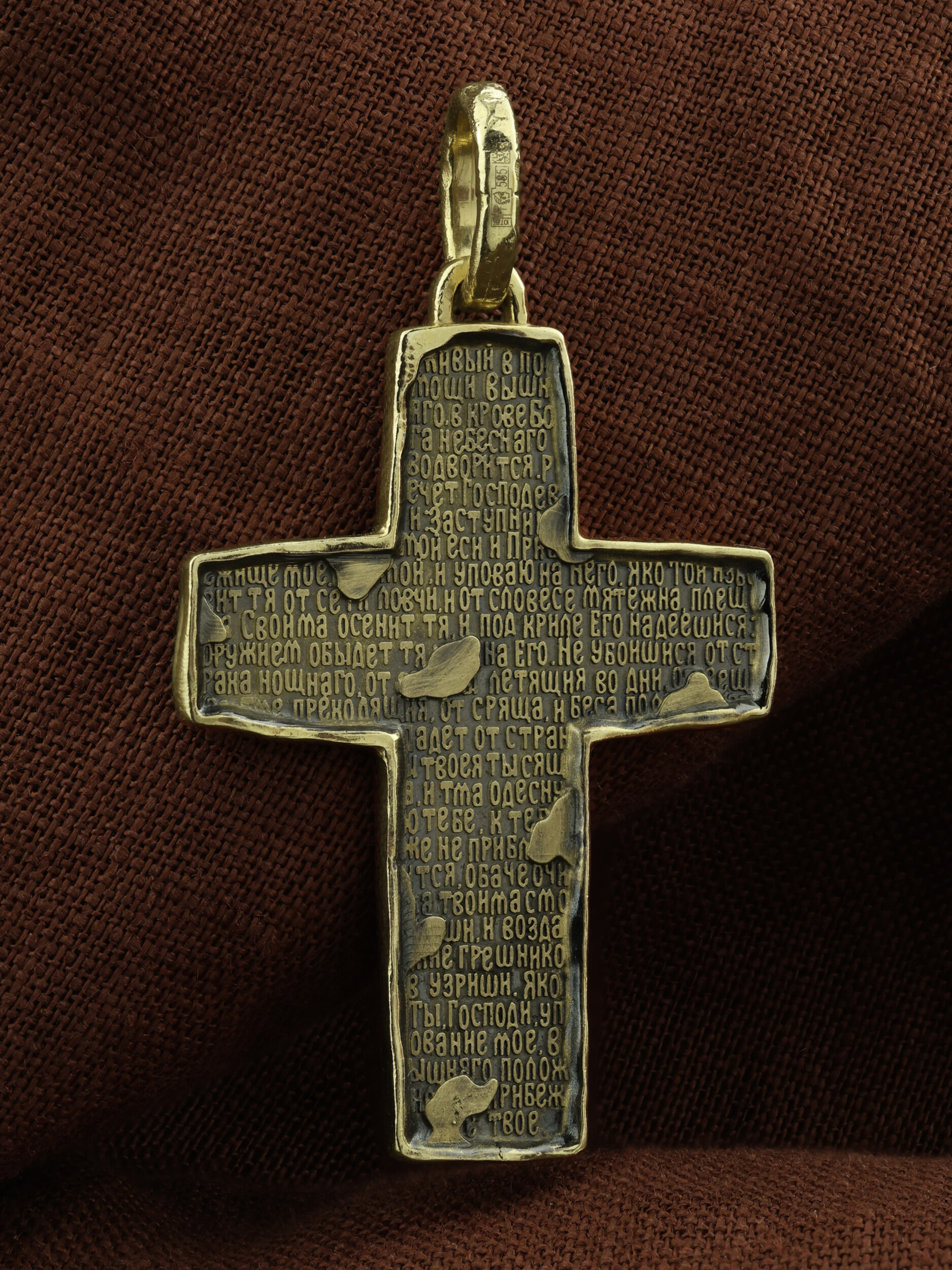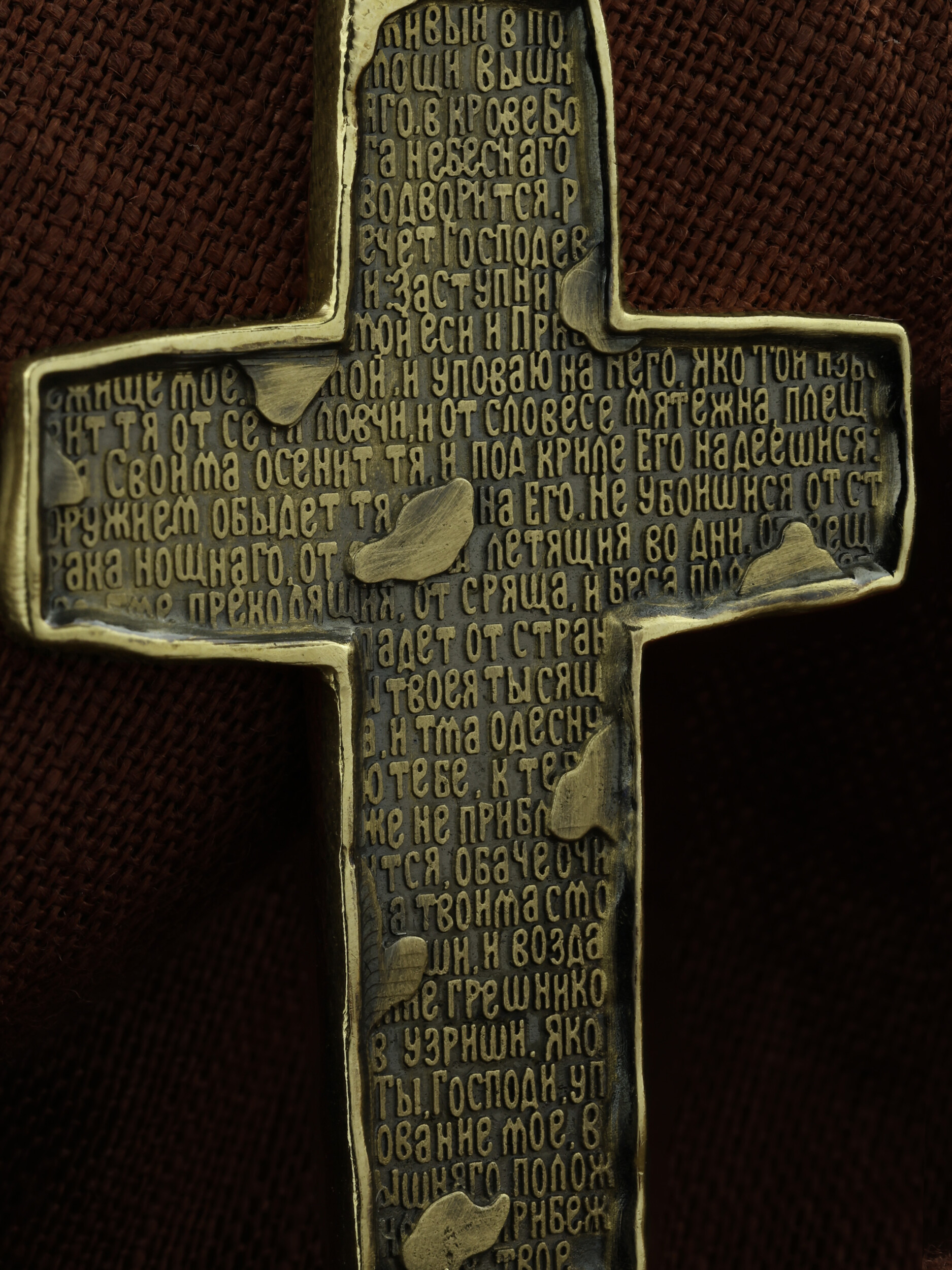 На оборотной стороне креста размещена часть 90 псалма царя Давида: «Живый в помощи Вышняго, в крове Бога Небеснаго водворится. Речет Господеви: Заступник мой еси и Прибежище мое, Бог мой, и уповаю на Него. Яко Той избавит тя от сети ловчи, и от словесе мятежна, плещма Своима осенит тя, и под криле Его надеешися: оружием обыдет тя истина Его. Не убоишися от страха нощнаго, от стрелы летящия во дни, от вещи во тме преходящия, от сряща, и беса полуденнаго. Падет от страны твоея тысяща, и тма одесную тебе, к тебе же не приближится, обаче очима твоима смотриши, и воздаяние грешников узриши. Яко Ты, Господи, упование мое, Вышняго положил еси прибежище твое. Не приидет к тебе зло, и рана не приближится телеси твоему, яко Ангелом Своим заповесть о тебе, сохранити тя во всех путех твоих. На руках возмут тя, да не когда преткнеши о камень ногу твою, на аспида и василиска наступиши, и попереши льва и змия. Яко на Мя упова, и избавлю и: покрыю и, яко позна имя Мое. Воззовет ко Мне, и услышу его: с ним есмь в скорби, изму его, и прославлю его, долготою дней исполню его, и явлю ему спасение Мое.»