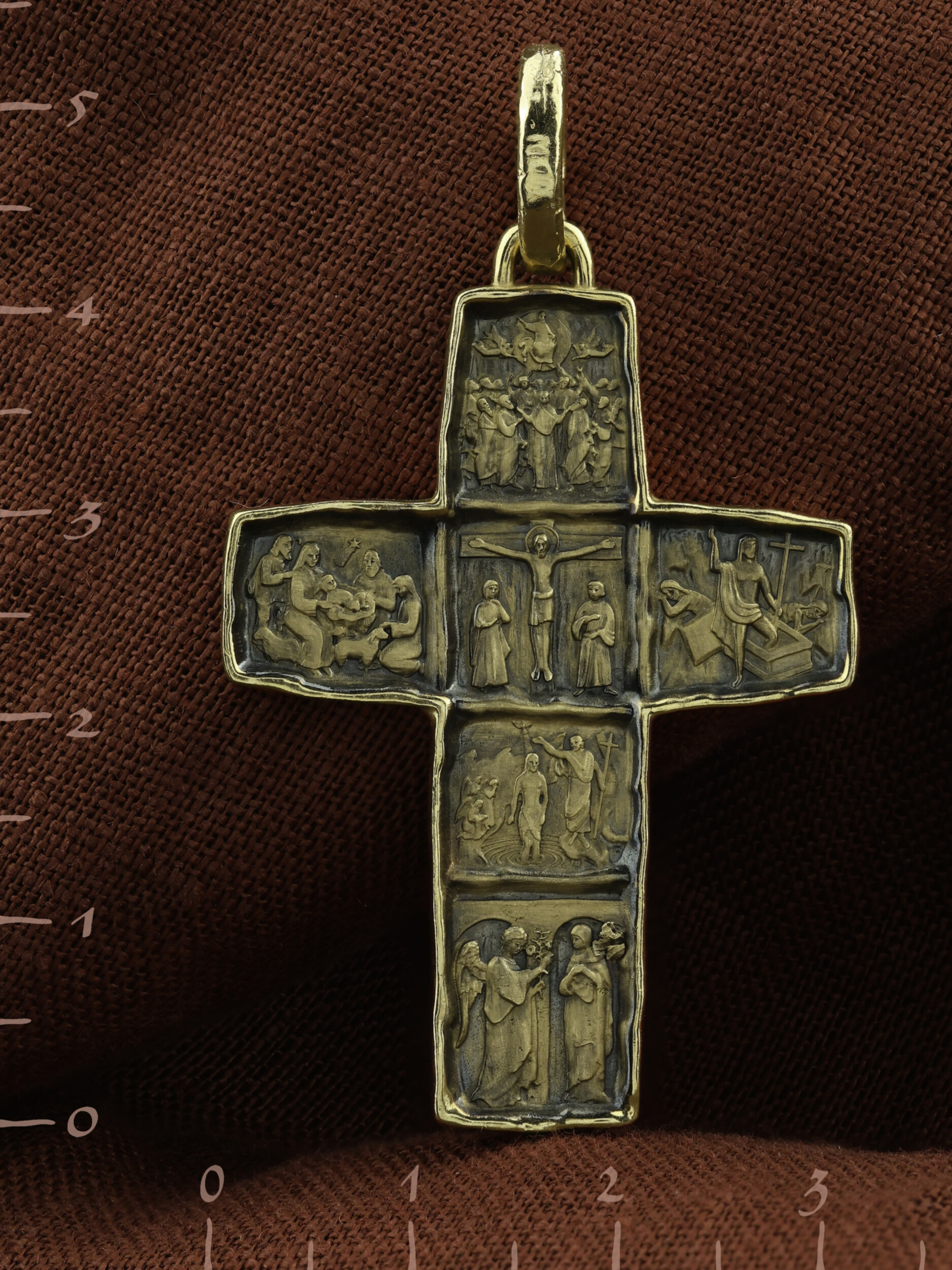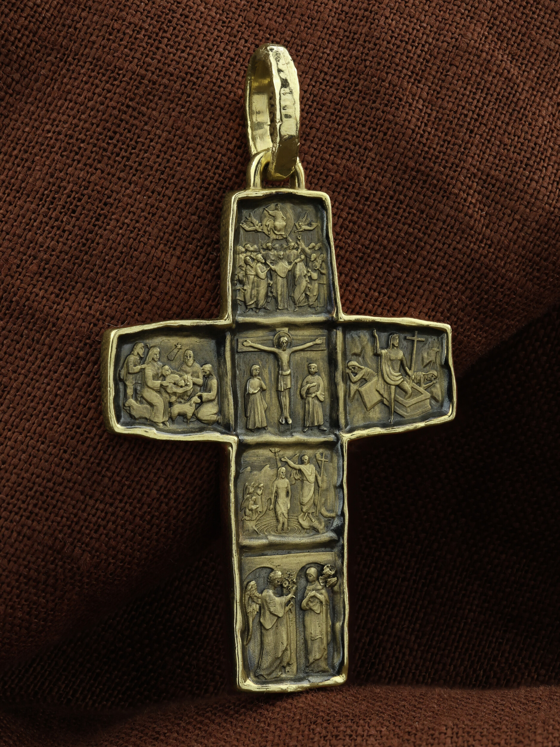 На лицевой стороне креста изображены основные события земной жизни, Крестные Страдания, Воскресение и Вознесение Господа и Спасителя нашего Иисуса Христа. Крест — символ спасения и искупления рода человеческого, знамение победы над смертью и адом. Иисус Христос, как искупительная жертва освобождения человечества от власти греха, умер крестной смертью и в третий день воскрес. В центре креста изображено Распятие Иисуса Христа на Кресте. Ниже Распятия размещено изображение Благовещения Пресвятой Богородицы, а так же Крещение Господне. Слева от Распятия изображено Рождество Господне, справа отображен образ Воскресшего из гроба Господа и Спасителя нашего Иисуса Христа. Над Распятием изображено Вознесение Господне.