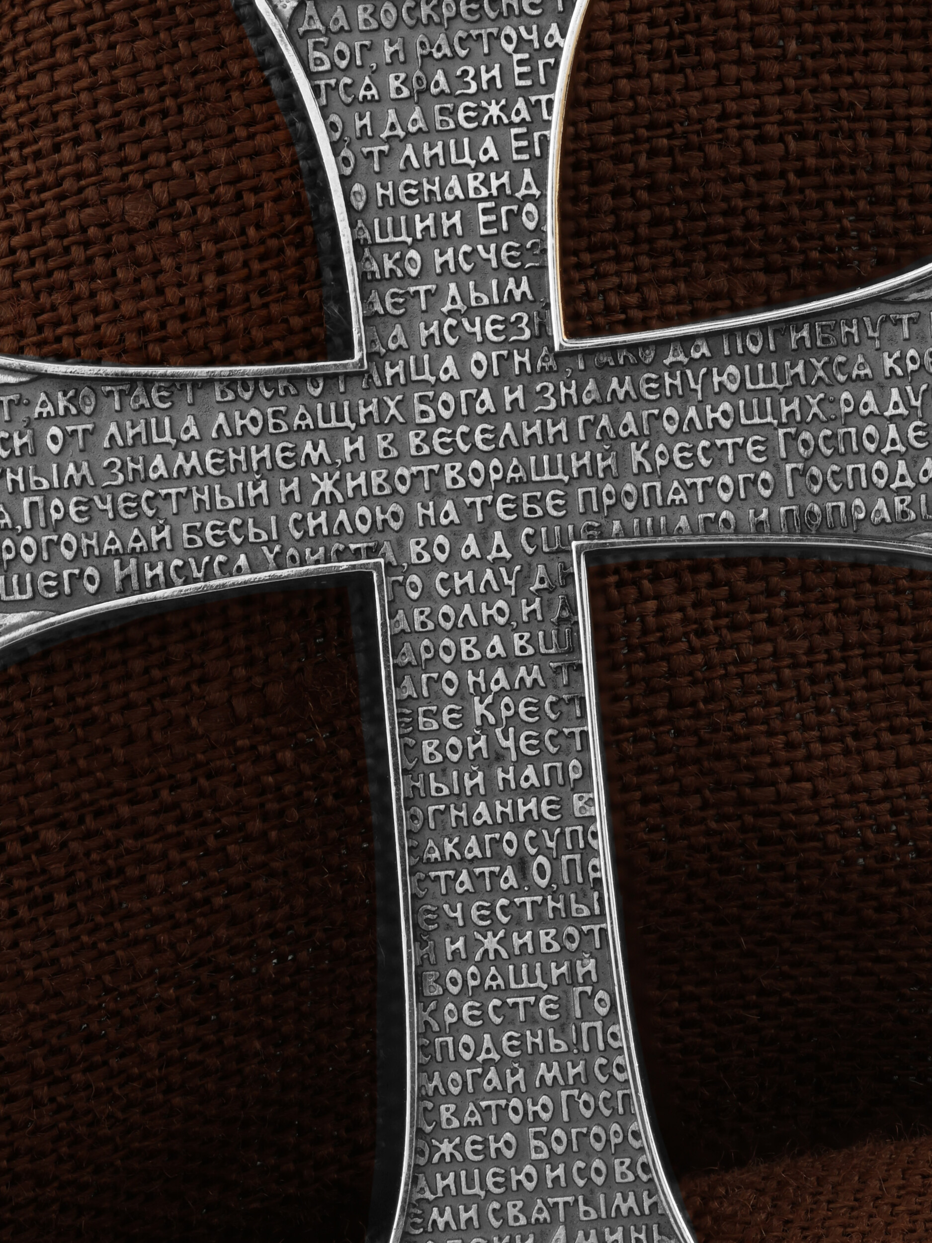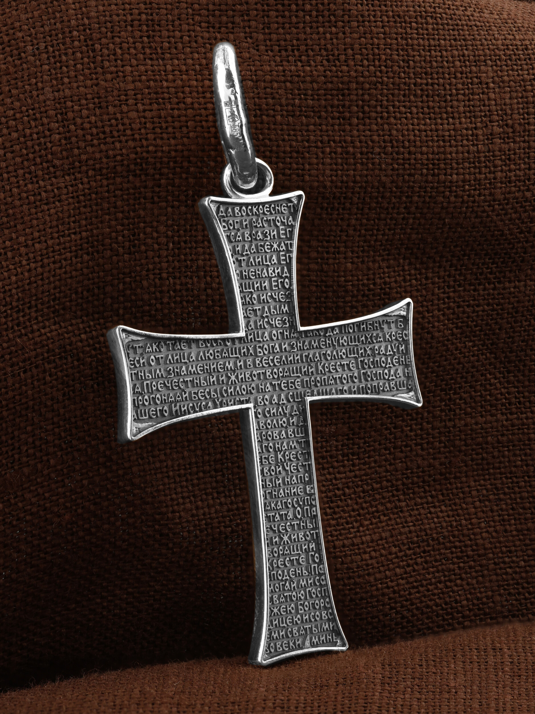 На оборотной стороне креста размещена молитва Честному и Животворящему Кресту Господню: «Да воскреснет Бог, и расточатся врази Его, и да бежат от лица Его ненавидящии Его. Яко исчезает дым, да исчезнут; яко тает воск от лица огня, тако да погибнут беси от лица любящих Бога и знаменующихся крестным знамением, и в веселии глаголющих: радуйся, Пречестный и Животворящий Кресте Господень, прогоняяй бесы силою на тебе пропятаго Господа нашего Иисуса Христа, во ад сшедшаго и поправшаго силу диаволю, и даровавшаго нам тебе Крест Свой Честный на прогнание всякаго супостата. О, Пречестный и Животворящий Кресте Господень! Помогай ми со Святою Госпожею Девою Богородицею и со всеми святыми во веки. Аминь».