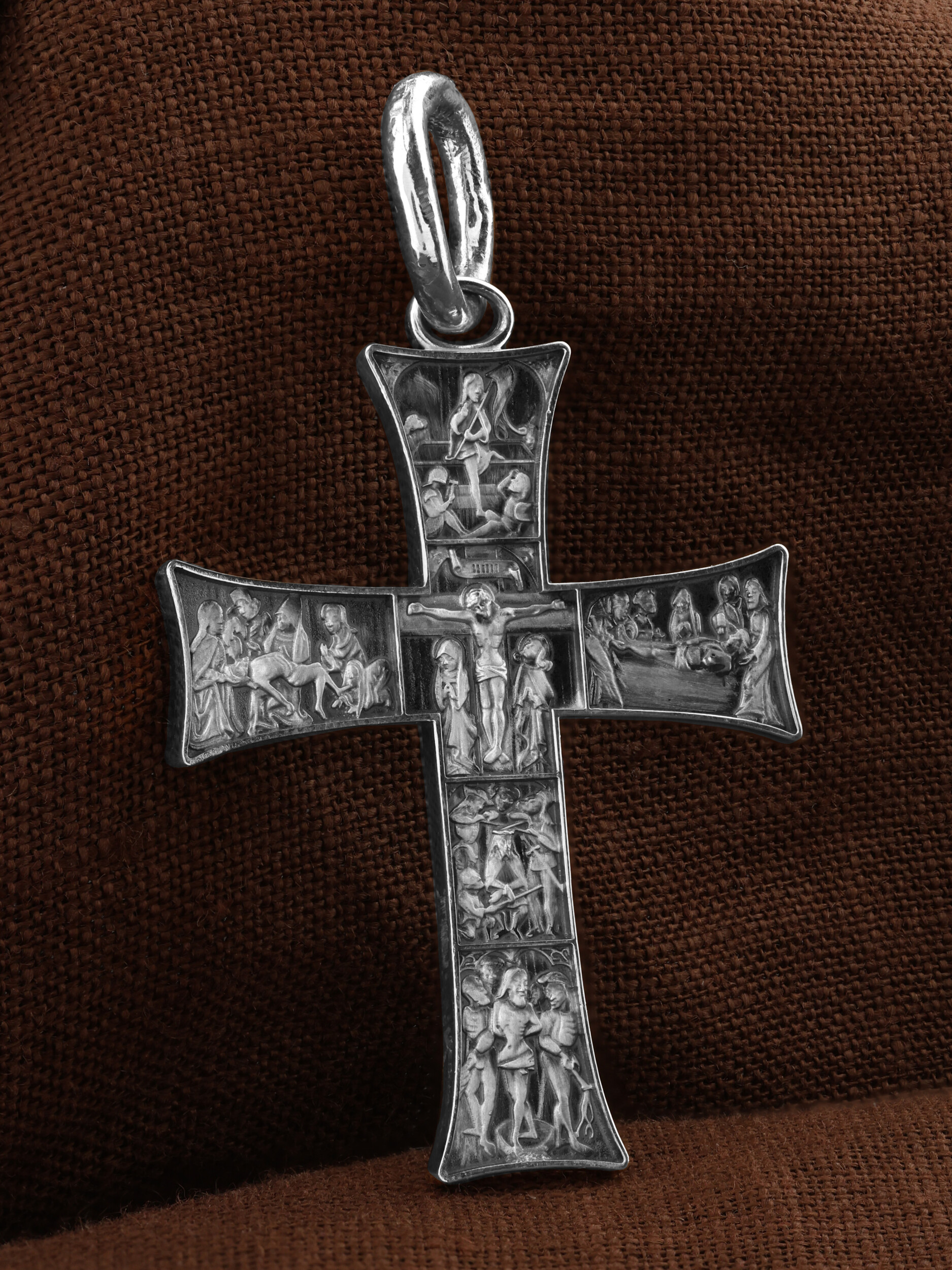 На лицевой стороне креста изображены Крестные Страдания и Воскресение Господа и Спасителя нашего Иисуса Христа. Крест- символ спасения и искупления рода человеческого, знамение победы над смертью и адом. Иисус Христос, как искупительная жертва освобождения человечества от власти греха, умер крестной смертью и в третий день воскрес. В центре креста изображено Распятие Иисуса Христа на Кресте. Ниже — взятие под стражу, а также пытки и мучения Христа перед Распятием. Слева от Распятия изображено снятие Господа с Креста, справа — положение во гроб. Над Распятием отображен образ Воскресшего из гроба Господа и Спасителя нашего Иисуса Христа.