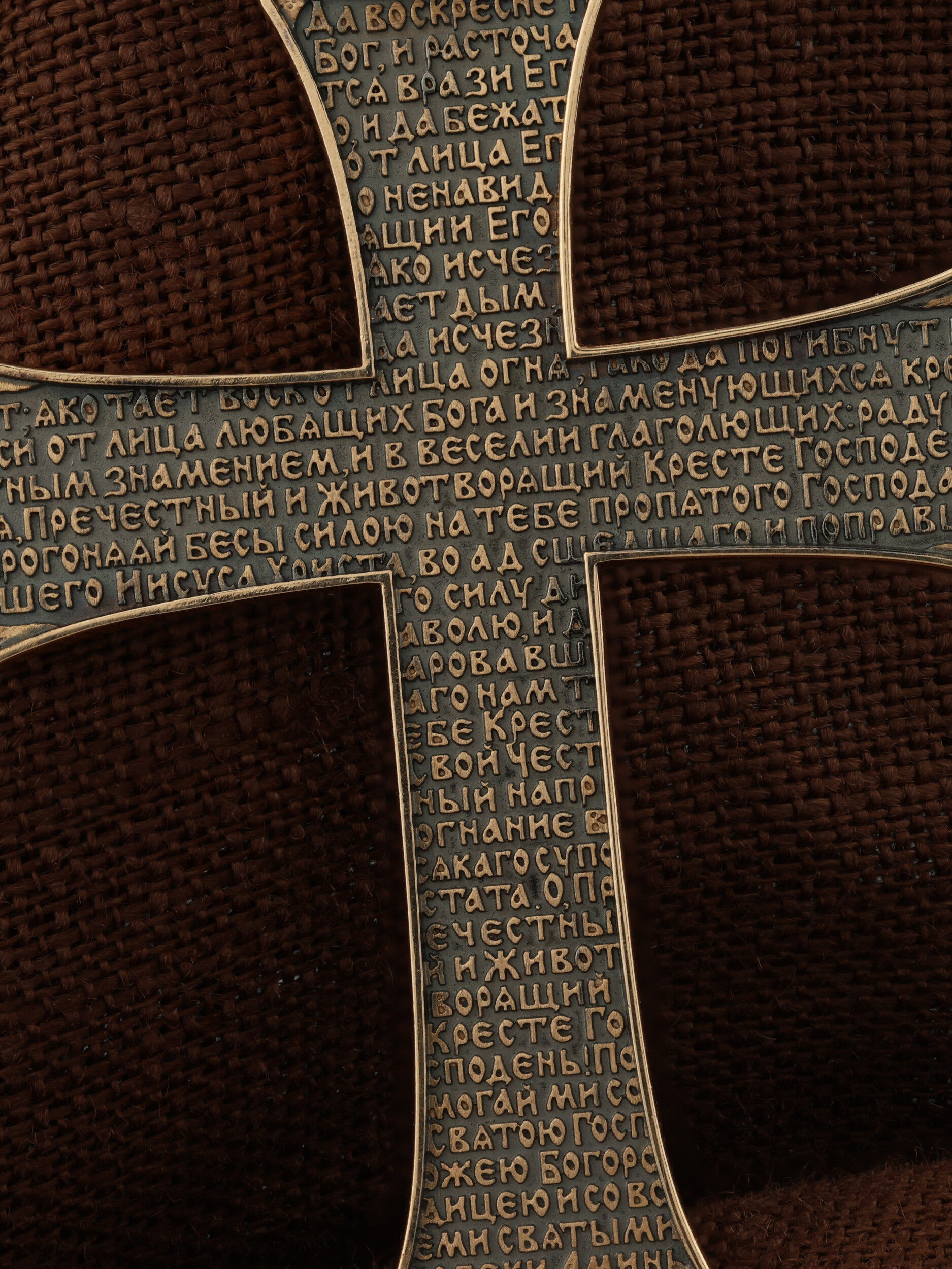 На оборотной стороне креста размещена молитва Честному и Животворящему Кресту Господню: «Да воскреснет Бог, и расточатся врази Его, и да бежат от лица Его ненавидящии Его. Яко исчезает дым, да исчезнут; яко тает воск от лица огня, тако да погибнут беси от лица любящих Бога и знаменующихся крестным знамением, и в веселии глаголющих: радуйся, Пречестный и Животворящий Кресте Господень, прогоняяй бесы силою на тебе пропятаго Господа нашего Иисуса Христа, во ад сшедшаго и поправшаго силу диаволю, и даровавшаго нам тебе Крест Свой Честный на прогнание всякаго супостата. О, Пречестный и Животворящий Кресте Господень! Помогай ми со Святою Госпожею Девою Богородицею и со всеми святыми во веки. Аминь».