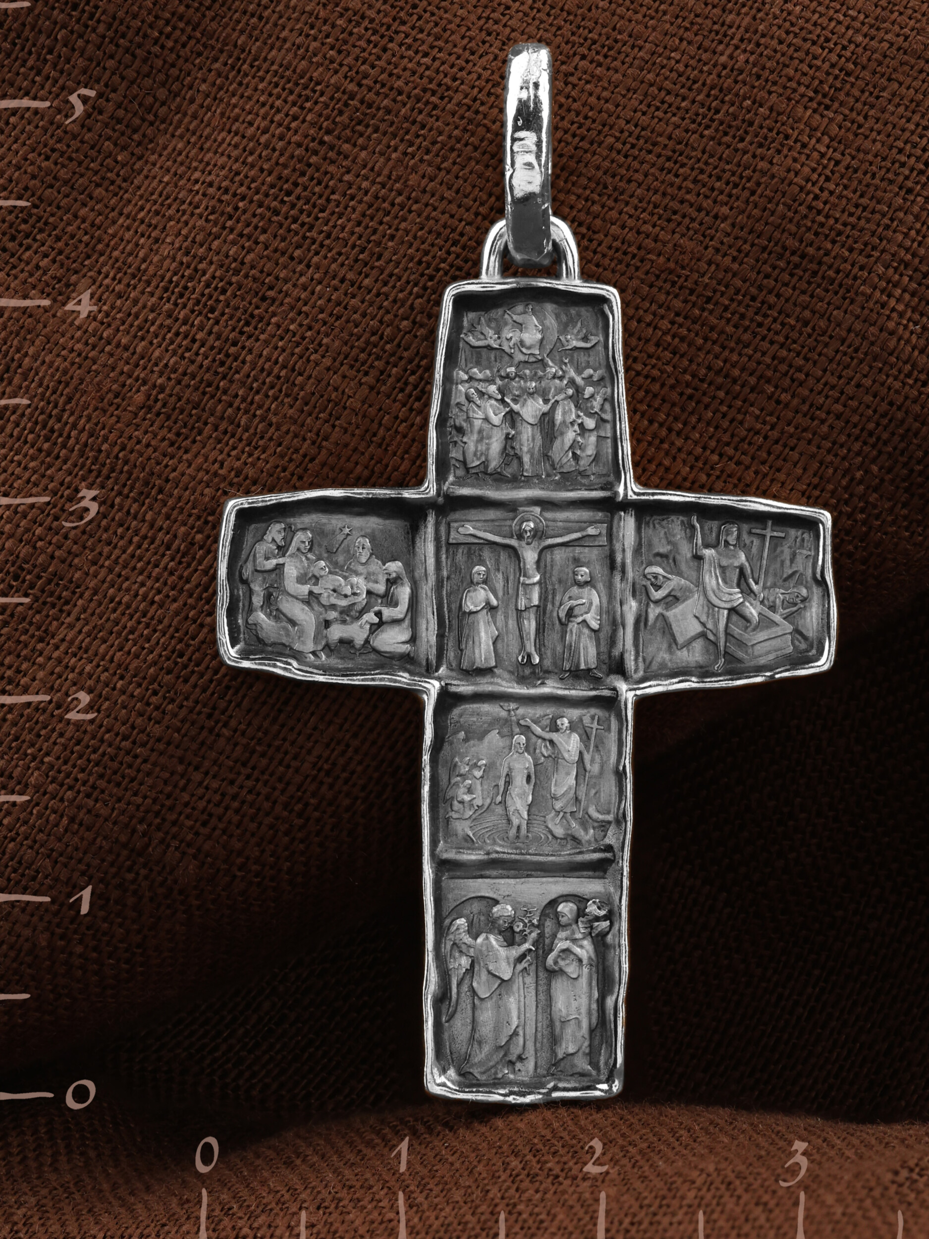 На лицевой стороне креста изображены основные события земной жизни, Крестные Страдания, Воскресение и Вознесение Господа и Спасителя нашего Иисуса Христа. Крест — символ спасения и искупления рода человеческого, знамение победы над смертью и адом. Иисус Христос, как искупительная жертва освобождения человечества от власти греха, умер крестной смертью и в третий день воскрес. В центре креста изображено Распятие Иисуса Христа на Кресте. Ниже Распятия размещено изображение Благовещения Пресвятой Богородицы, а так же Крещение Господне. Слева от Распятия изображено Рождество Господне, справа отображен образ Воскресшего из гроба Господа и Спасителя нашего Иисуса Христа. Над Распятием изображено Вознесение Господне.