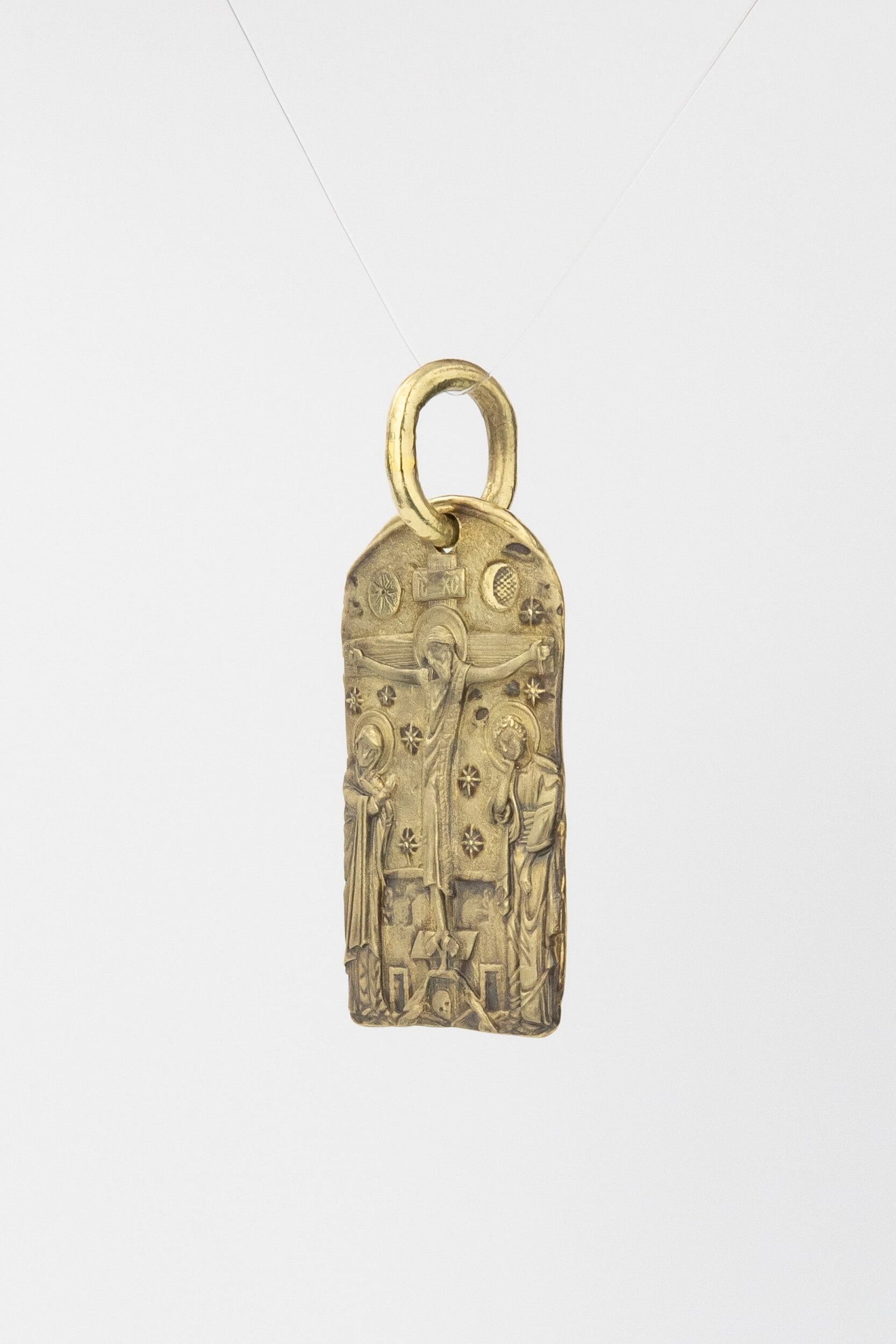 На лицевой стороне образка изображено Распятие Господа и Спасителя нашего Иисуса Христа. Своими крестными страданиями Господь смыл наши грехи, покрыл наш долг перед Богом. В Голгофе сокрыта непостижимая тайна бесконечной правды и любви Бога. Крест стал символом победы добра над злом, жизни над смертью, напоминанием бесконечной Божьей любви, предметом радости. Воплотившийся Сын Божий Своею кровью освятил крест и сделал его проводником Своей благодати, источником освящения верующих. На верхней табличке, выше головы Иисуса, написано сокращенно имя Спасителя «IC» «XC» — Иисус Христос. Слева от Распятия стоят оплакивающие Господа Пресвятая Богородица, справа — апостол и евангелист Иоанн Богослов, один из ближайших учеников Иисуса Христа. По преданию, увидя, что они горько плачут, Иисус сказал Матери Своей: «Жено! Се сын Твой!» Потом сказал ученику Иоанну: «Се мати твоя». С этого времени Иоанн взял Матерь Божию к себе, и Она жила в его доме до самой смерти.