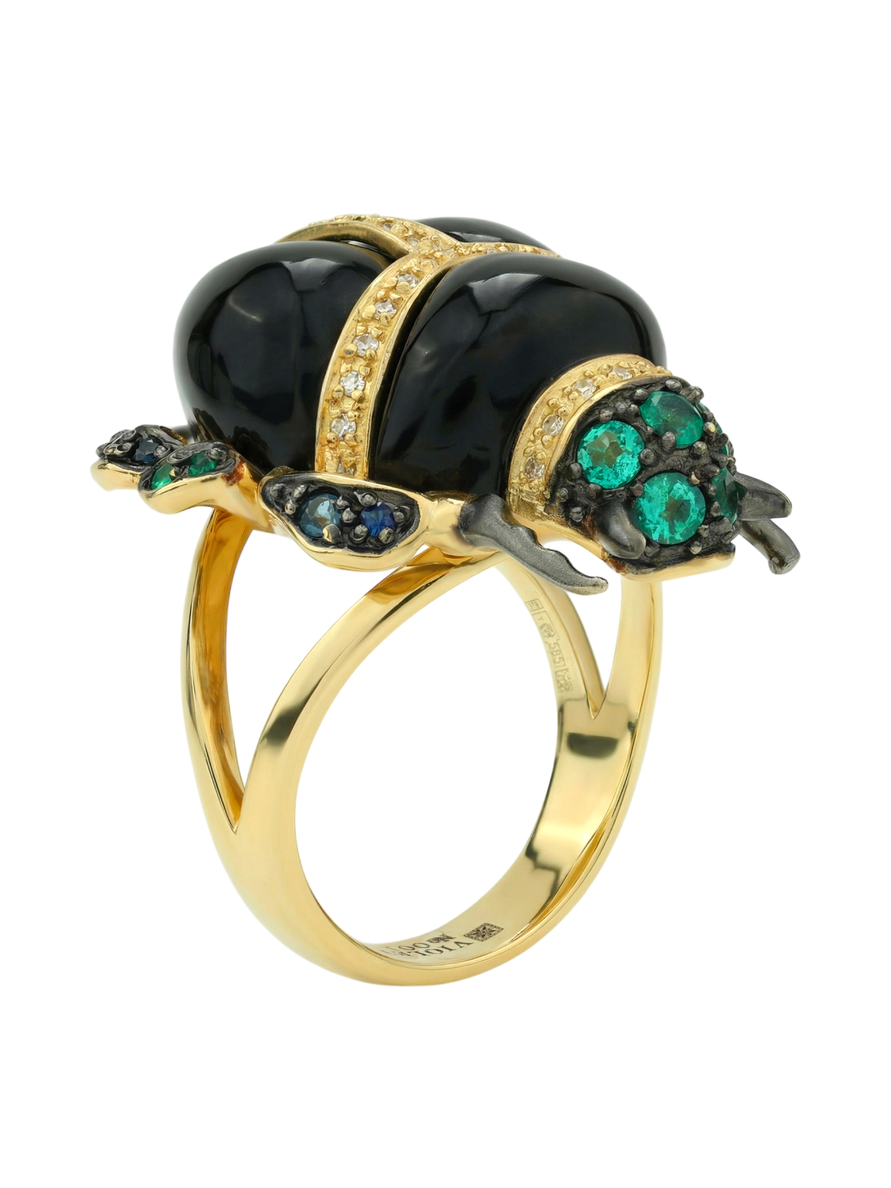 Кольцо из лимонного золота c бриллиантами, сапфиром, изумрудом и ониксом