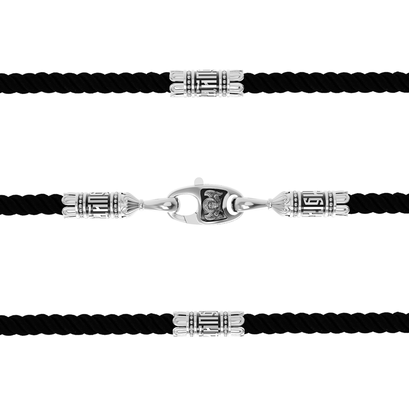 На шнурке цепи-шнурка расположены вставки, а на концах концевики с надписью: «Спаси и сохрани». Соединяет концевики замочек-карабин в форме рыбки. На замочке изображен шестикрылый Серафим.