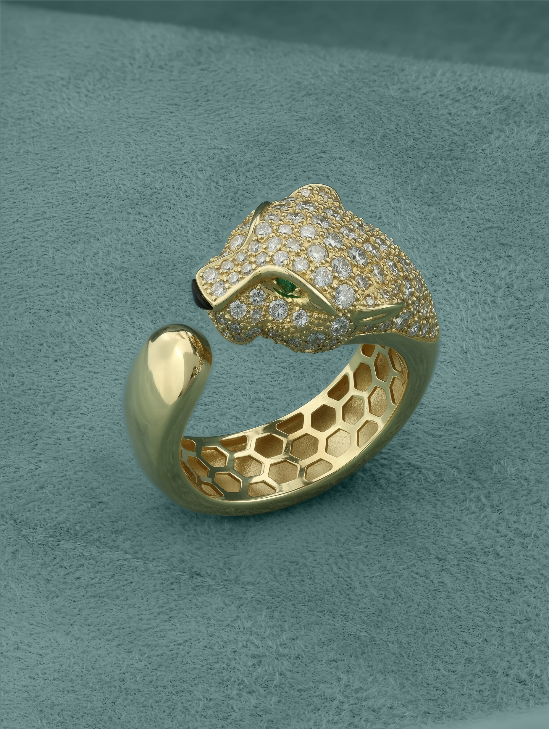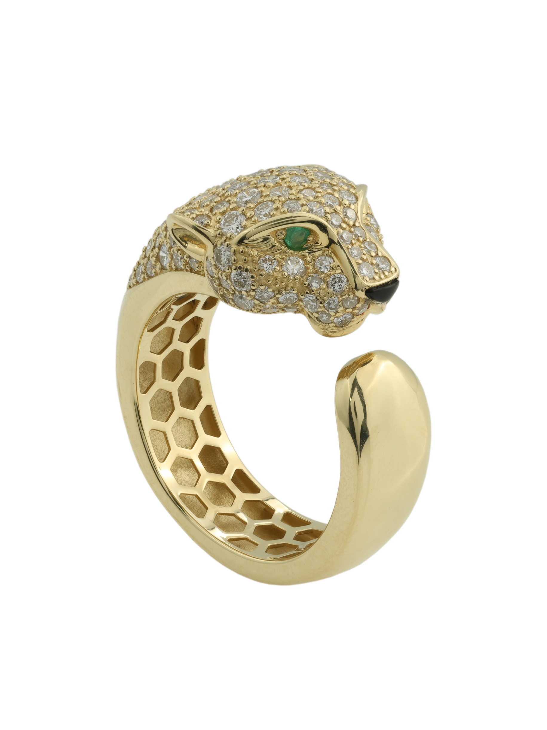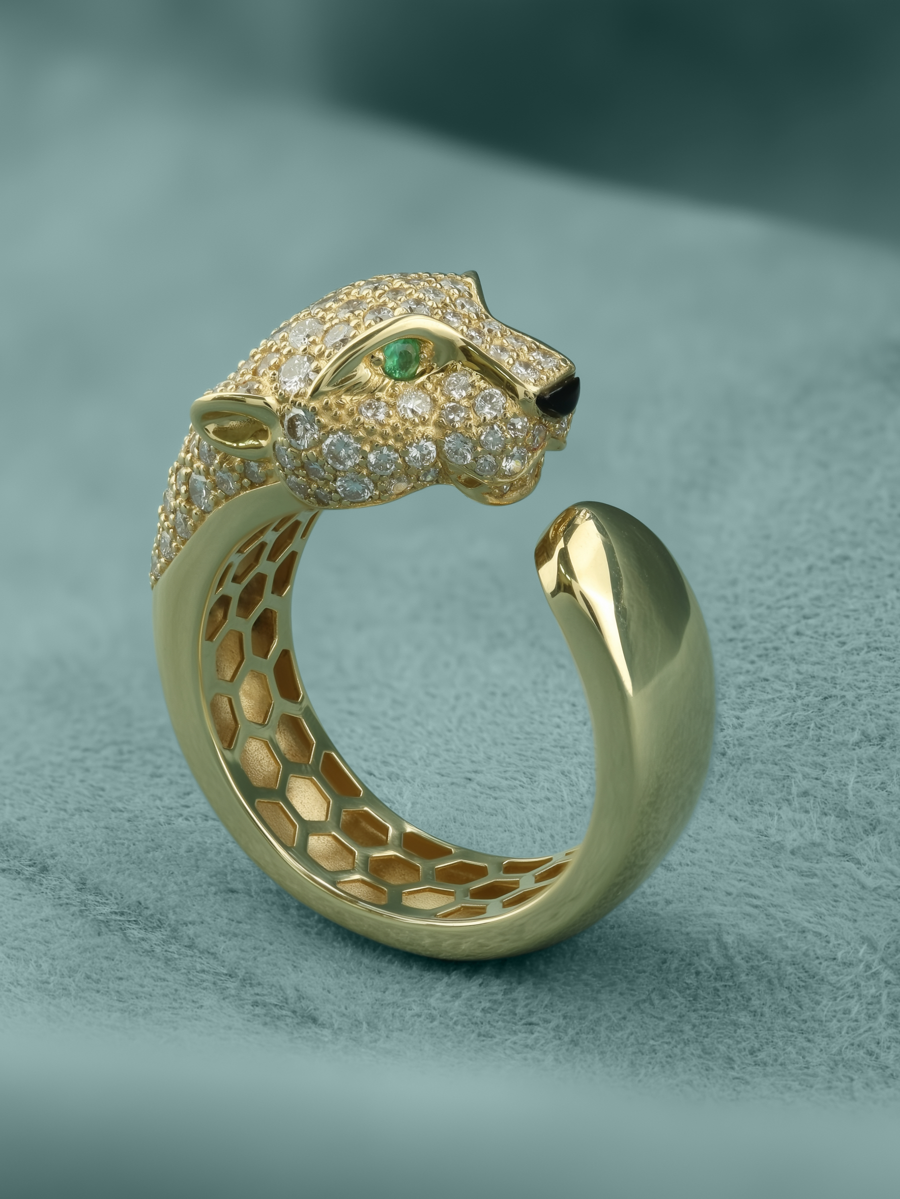 Кольцо из лимонного золота c бриллиантами, изумрудом и ониксом