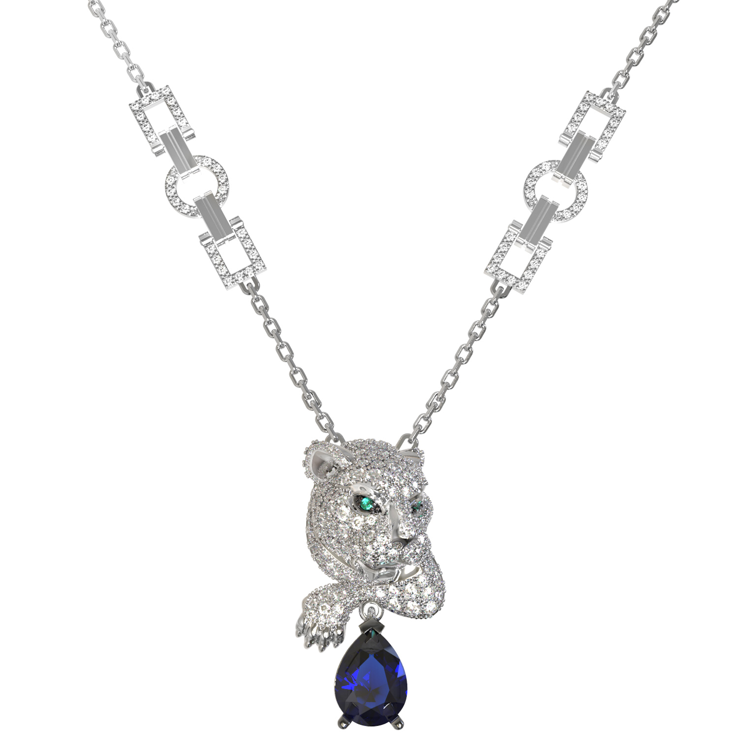 Колье из белого золота c бриллиантами, сапфиром и изумрудом