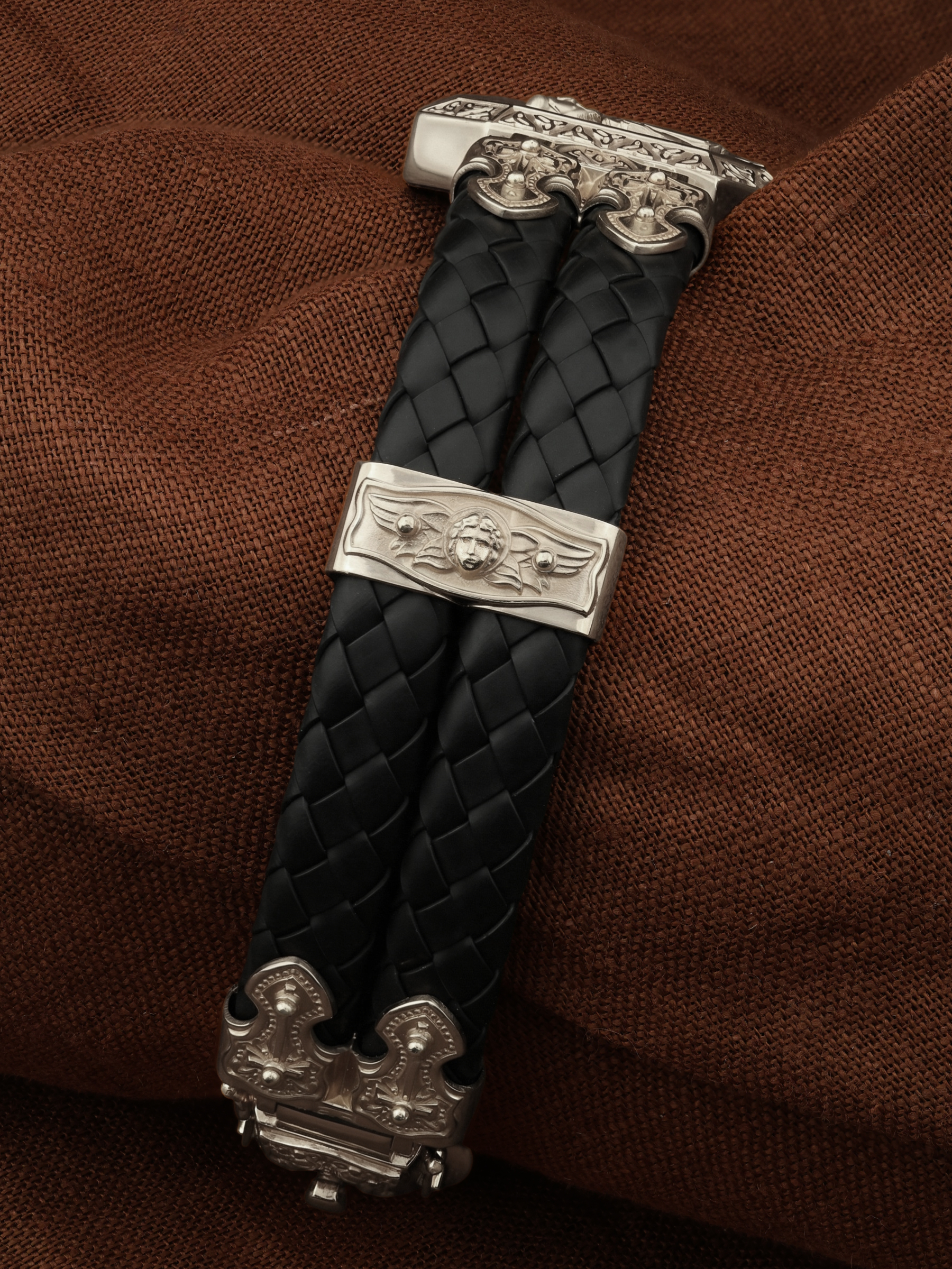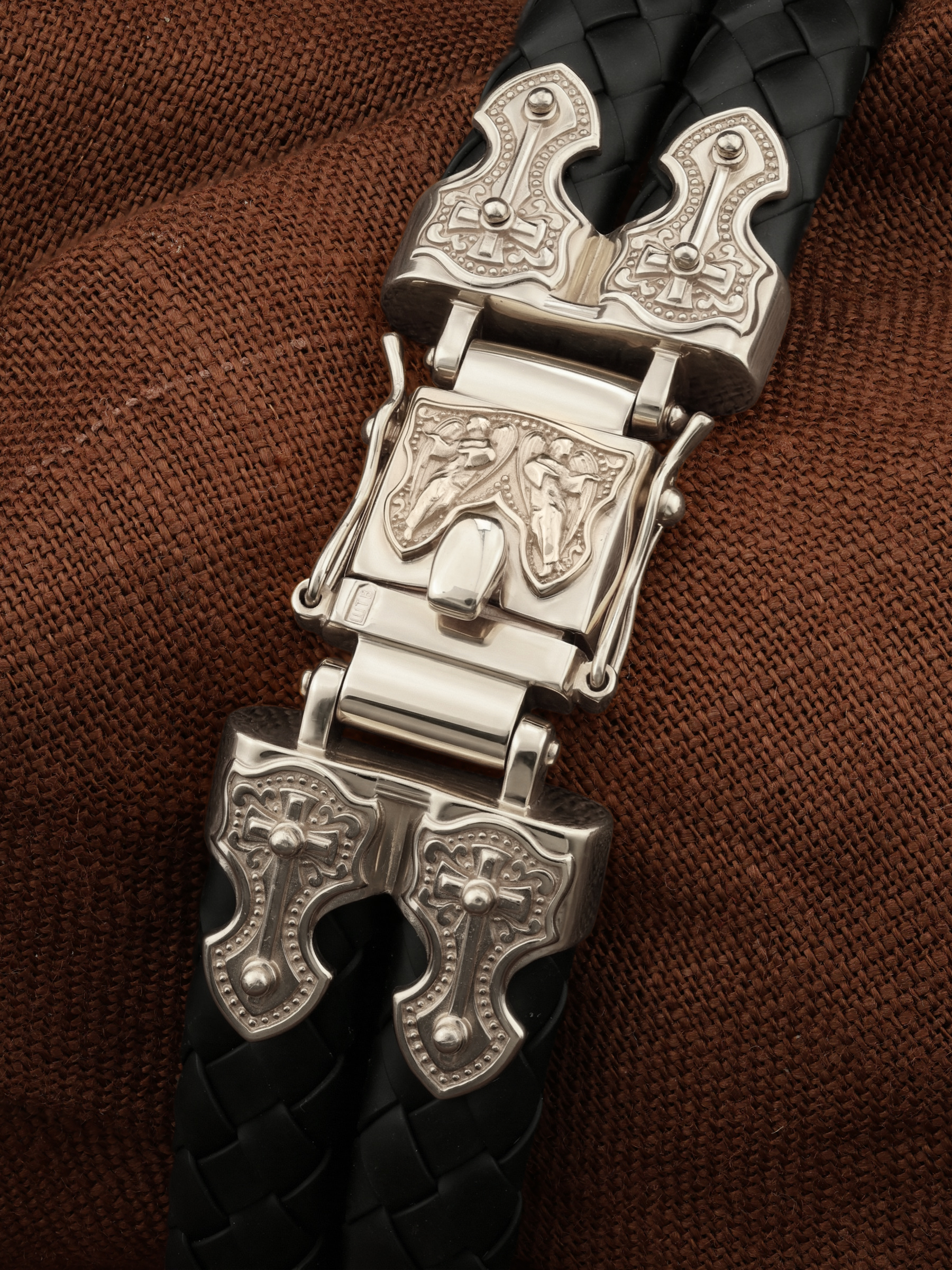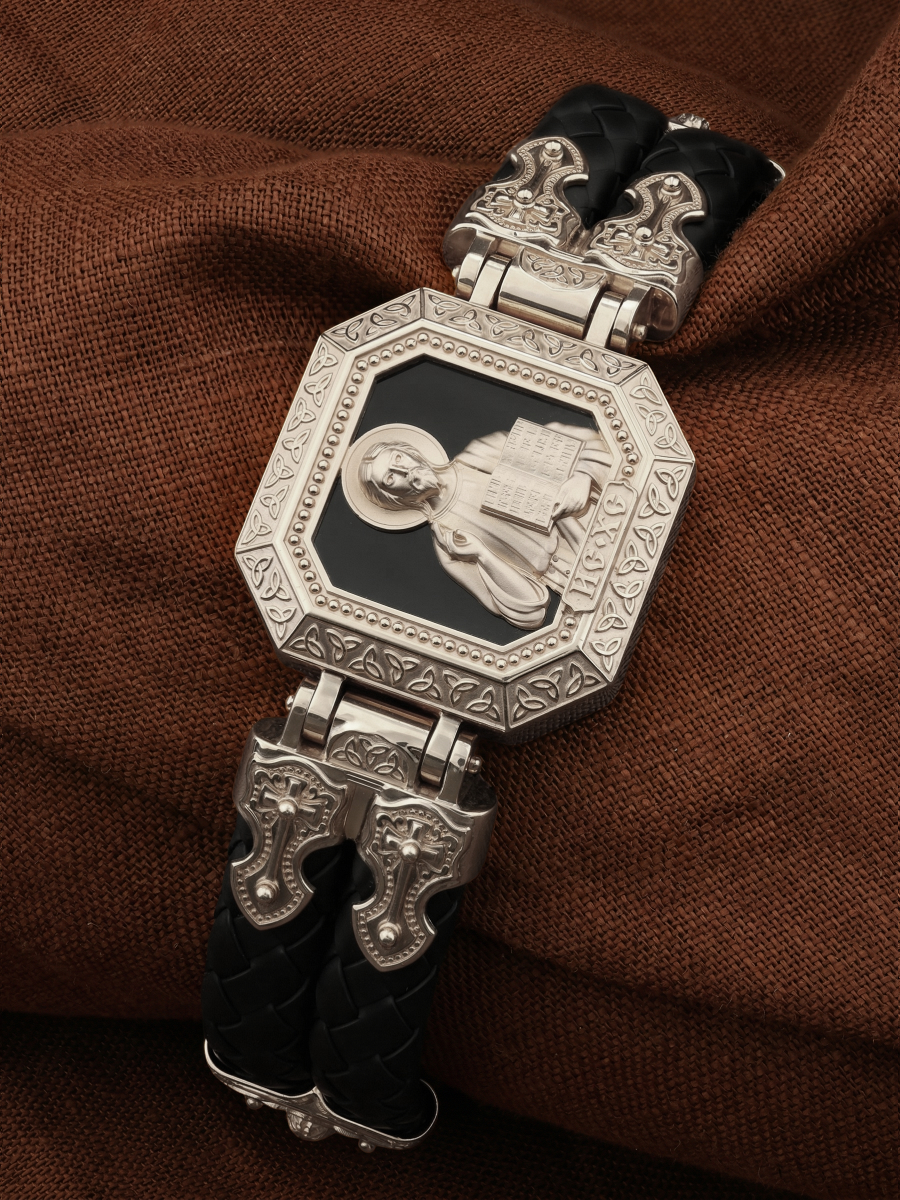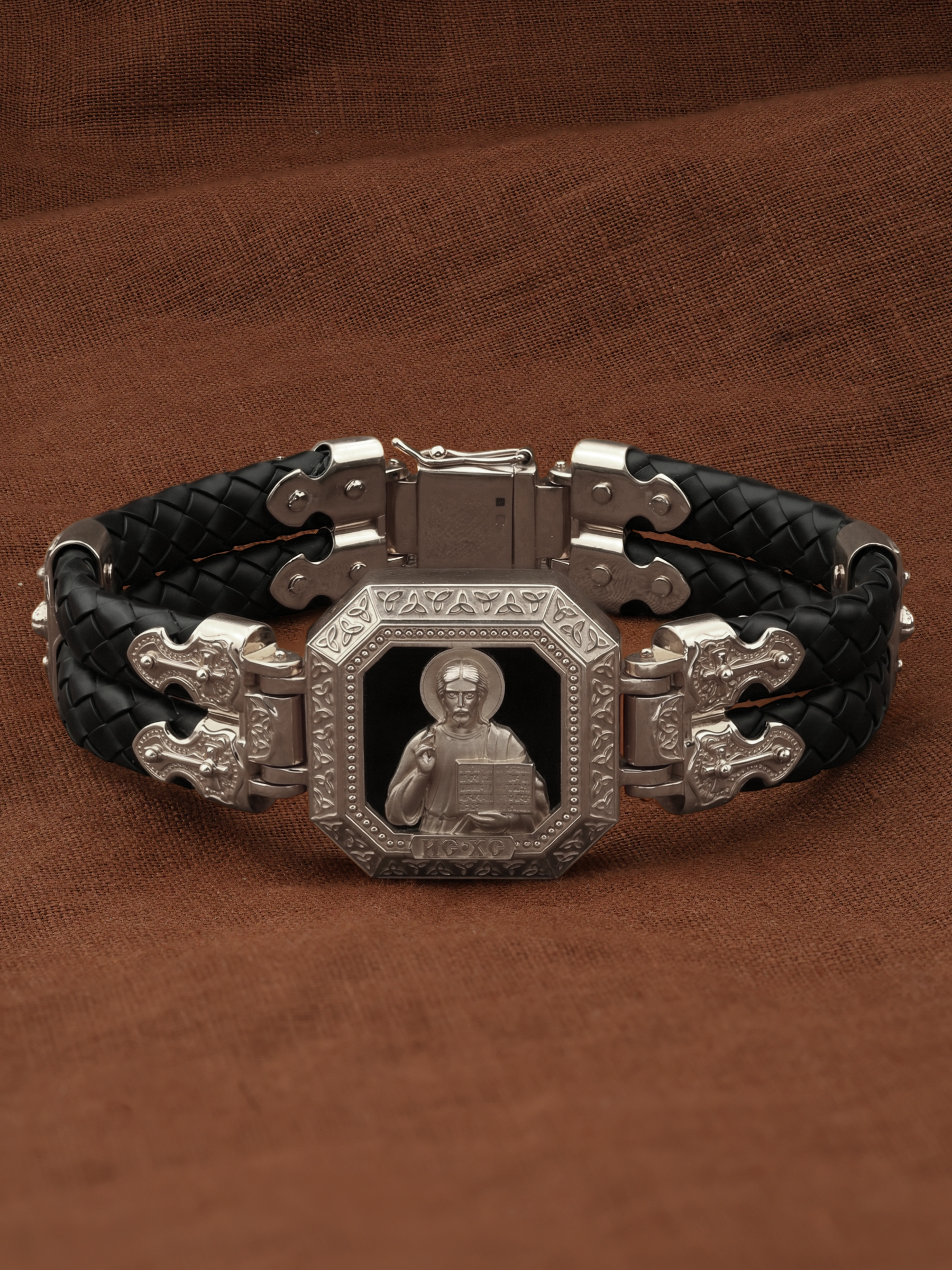 На лицевой стороне основного звена изображена икона Господа и Спасителя нашего Иисуса Христа — Господь Вседержитель или Пантократор (от греч. всевластный, всесильный). Он представлен как Царь Небесный и будущий Судия мира. Именование Иисуса «Вседержителем» указывает, с одной стороны, на Его Божественную природу: «Аз есмь Альфа и Омега, начало и конец, говорит Господь, Который есть и был и грядет, Вседержитель» (Откр. 1: 8). С другой стороны, такое именование связано и с человеческой природой Христа, искупившего крестной жертвой людские грехи и обновившего тем самым человеческую природу. Господь Иисусь Христос изображен фронтально огрудно. Главу Спасителя осеняет нимб, на нем угадывается крест. Крест символизирует голгофскую жертву Спасителя. По греческой традиции, на нимбе написаны буквы Омега, Омикрон, Ню — вместе они обозначают слово Сущий, одно из имен и характеристику Бога, согласно Священному Писанию. Правой рукой Он благословляет, а левой держит Евангелие — благую весть, принесенную Христом всему миру. Также означает она тот новый мир, который будет сотворен Богом после второго пришествия Христа. Символизирует и Книгу Жизни, где записаны имена всех, возлюбивших Бога. Всемогущий Бог предстает здесь не как обличающий судья, а как милостивый отец, ждущий возвращения блудных детей.