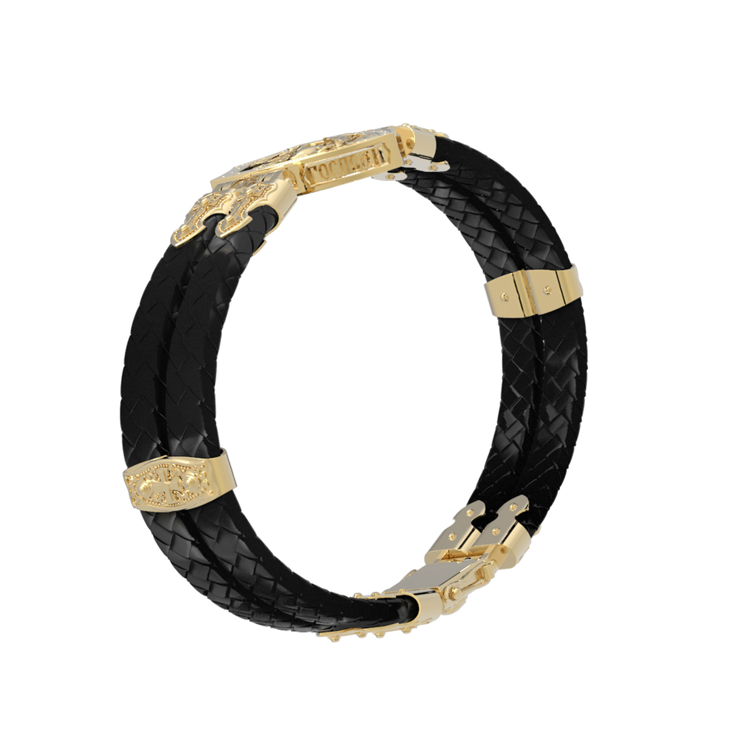 Основой композиции лицевой стороны браслета является изображение Святого Великомученика Георгия Победоносца — одного из самых почитаемых и удивительных святых. Георгий родился в Каппадокии (Малая Азия) в семье богатых и знатных горожан. Юношей поступил на службу к римскому императору Диоклетиану, за отличное знание военного дела и проявленную в боях и походах храбрость был приближен к императору и удостоен высокого воинского звания. Во время начавшихся гонений на христиан, перешел на сторону гонимых и, отвергнув человеческий страх, стал ярым проповедником учения Христа. Мучители подвергли опального воеводу жесточайшим восьмидневным пыткам и казнили его (обезглавили) в возрасте около тридцати лет в 303 году. На Руси он известен как Юрий или Егорий, заступник для верующих, чья жизнь имеет какое-либо отношение к военным делам, помощник в крестьянском труде. Браслет сделан в виде воинского щита. На нем Георгий изображен как воитель, сидящий на вздыбленном коне и поражающий копьем огнедышащего змея. Над образом изображена благословляющая Божия десница. Змей символизирует собою сатанинские силы. Молитвами вознесенными к Всевышнему и своей непреклонной верой он смог одолеть чудовище. Святой убил змея, спас царскую дочь, принесенную в жертву, и жителей города, их души от влияния дьявола, породив в них надежду и веру в Господа, призывая людей принять христианскую веру. На торце изделия помещена молитва: «Господи, помилуй мя грешного».