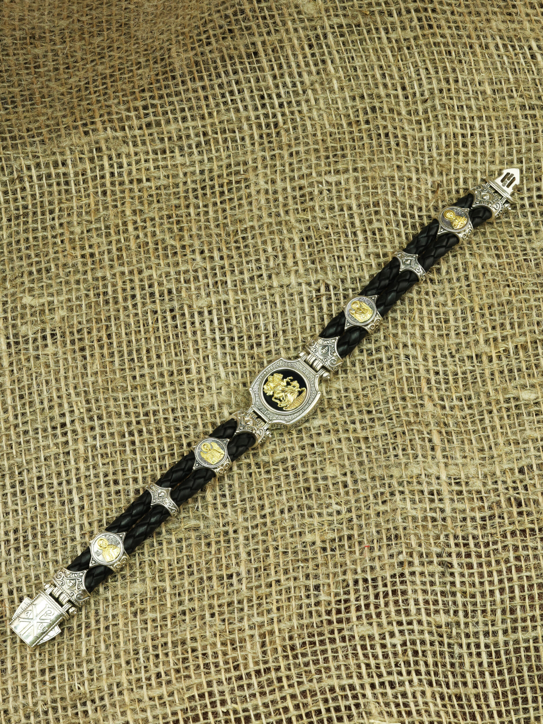 Браслет из серебра и золота c кожаным шнурком и ониксом