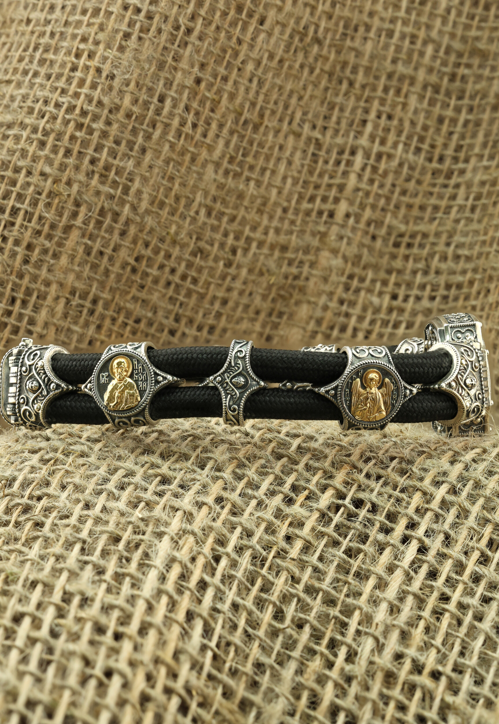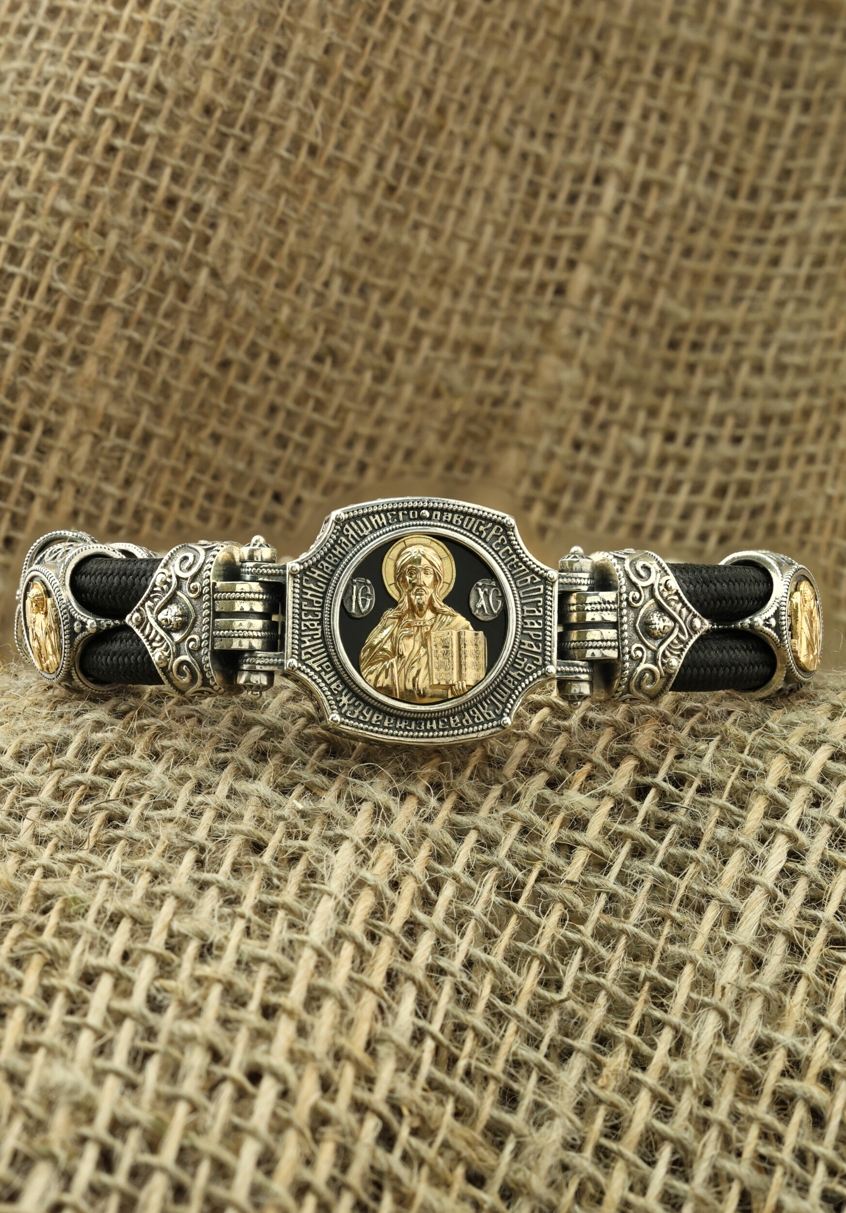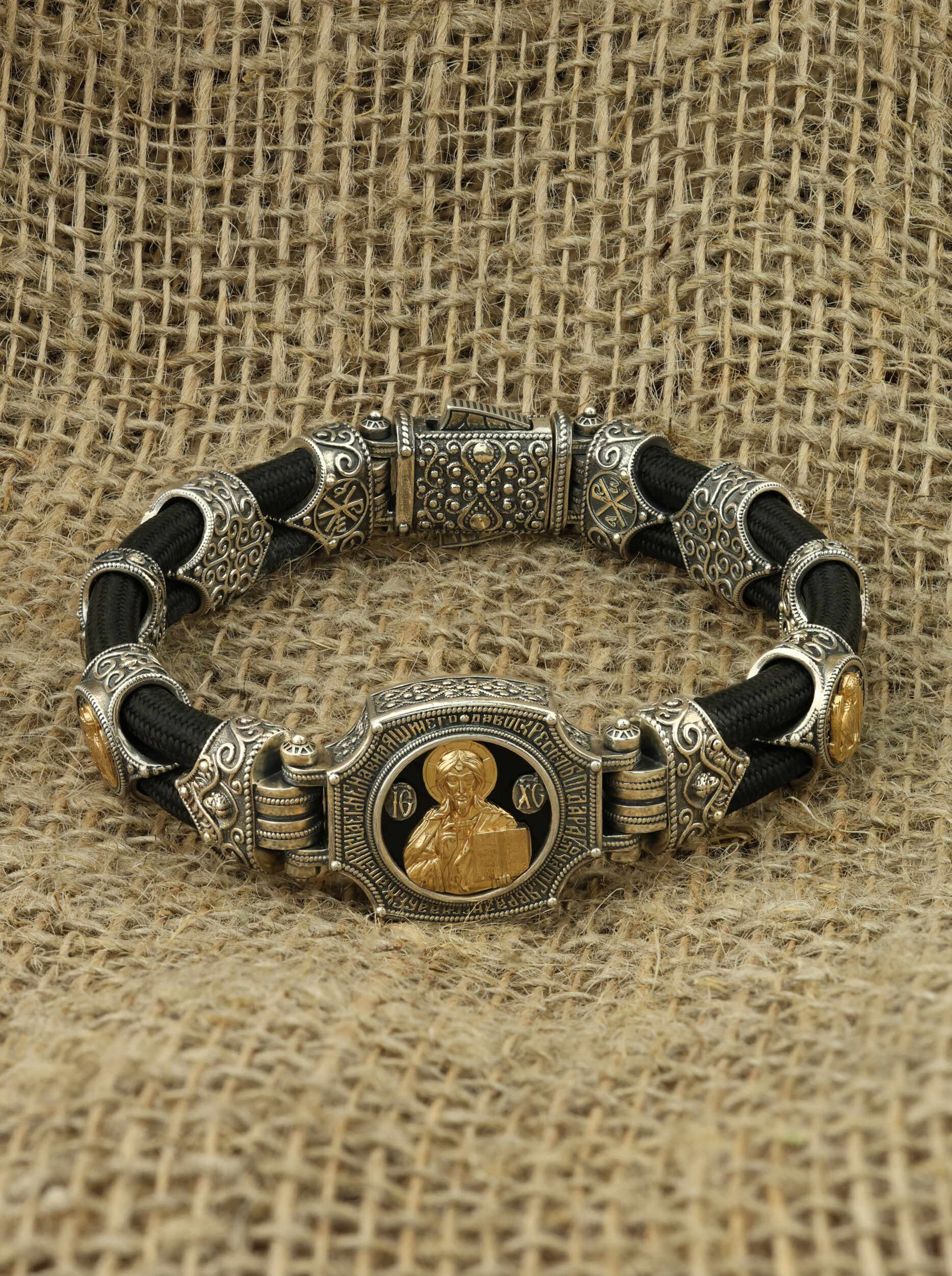Браслет из серебра и золота c ониксом и шёлковым шнурком