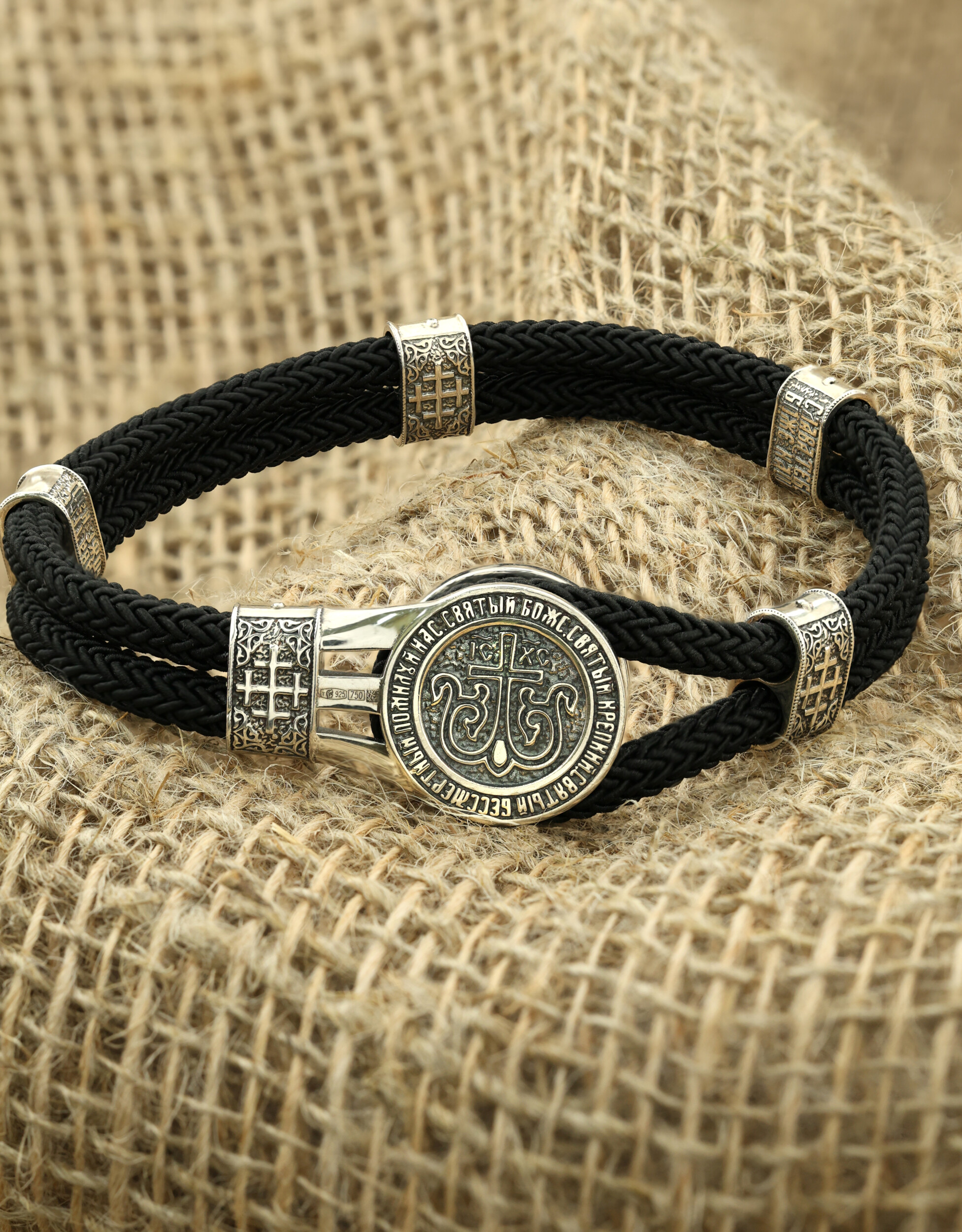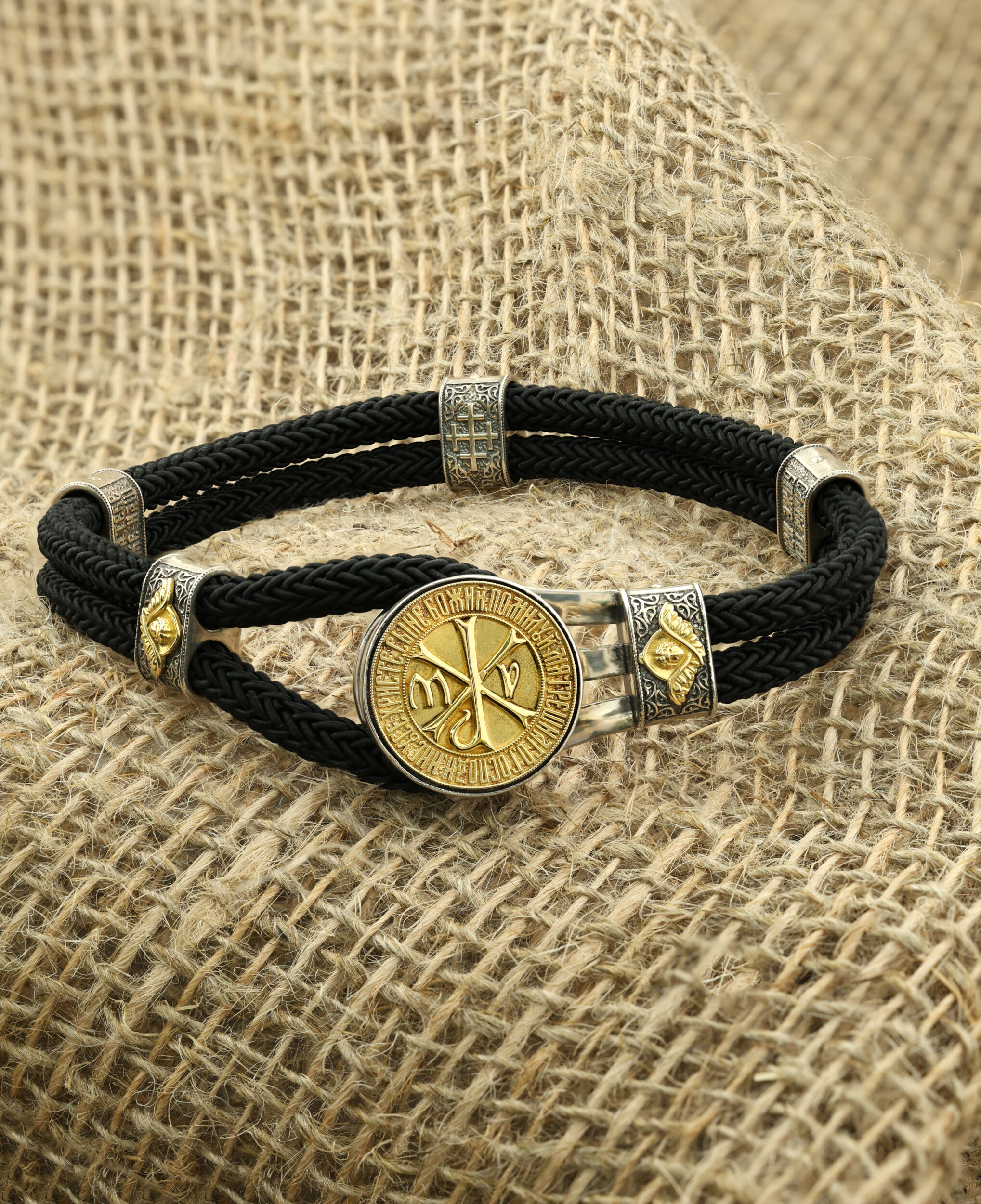 Браслет из серебра и золота c шёлковым шнурком
