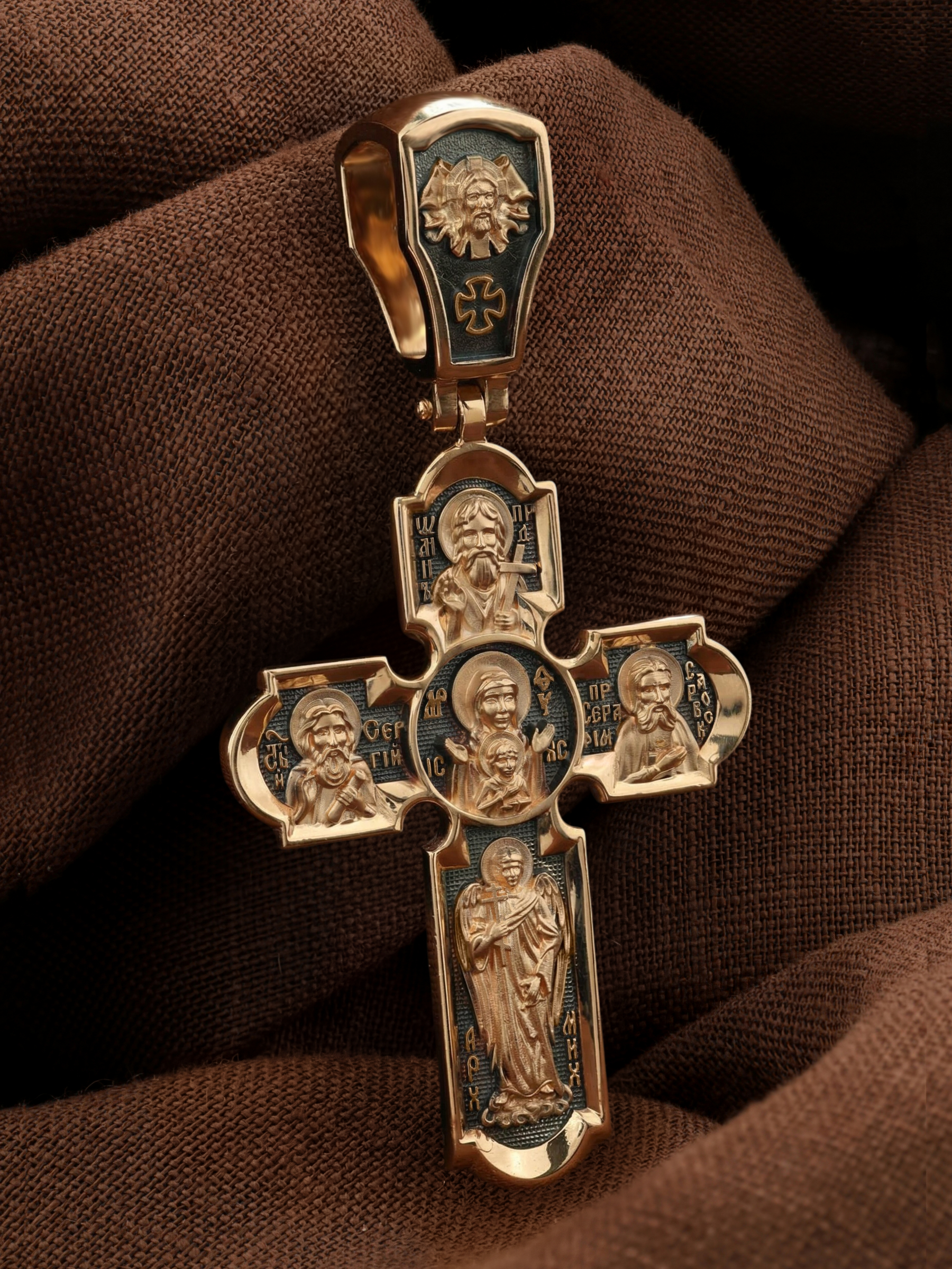 Центральную часть оборота креста украшает икона Божией Матери «Знамение». Икона «Знамение» написана по пророчеству пророка Исайи, предрекшего, что Господь Иисус Христос родится от Девы. На кресте внизу изображен Архангел Михаил, слева — прп. Сергий Радонежский, справа — образ Преподобного Серафима Саровского, вверху — последний пророк, почитающийся в христианстве, Предтеча Господень Иоанн Креститель. На кулонном кольце помещено изображение Спаса Нерукотворного — образ Спасителя, который Он запечатлел на плате и передал для исцеления больному проказой царю Эдессы. Ему придается победное и защитное значение.