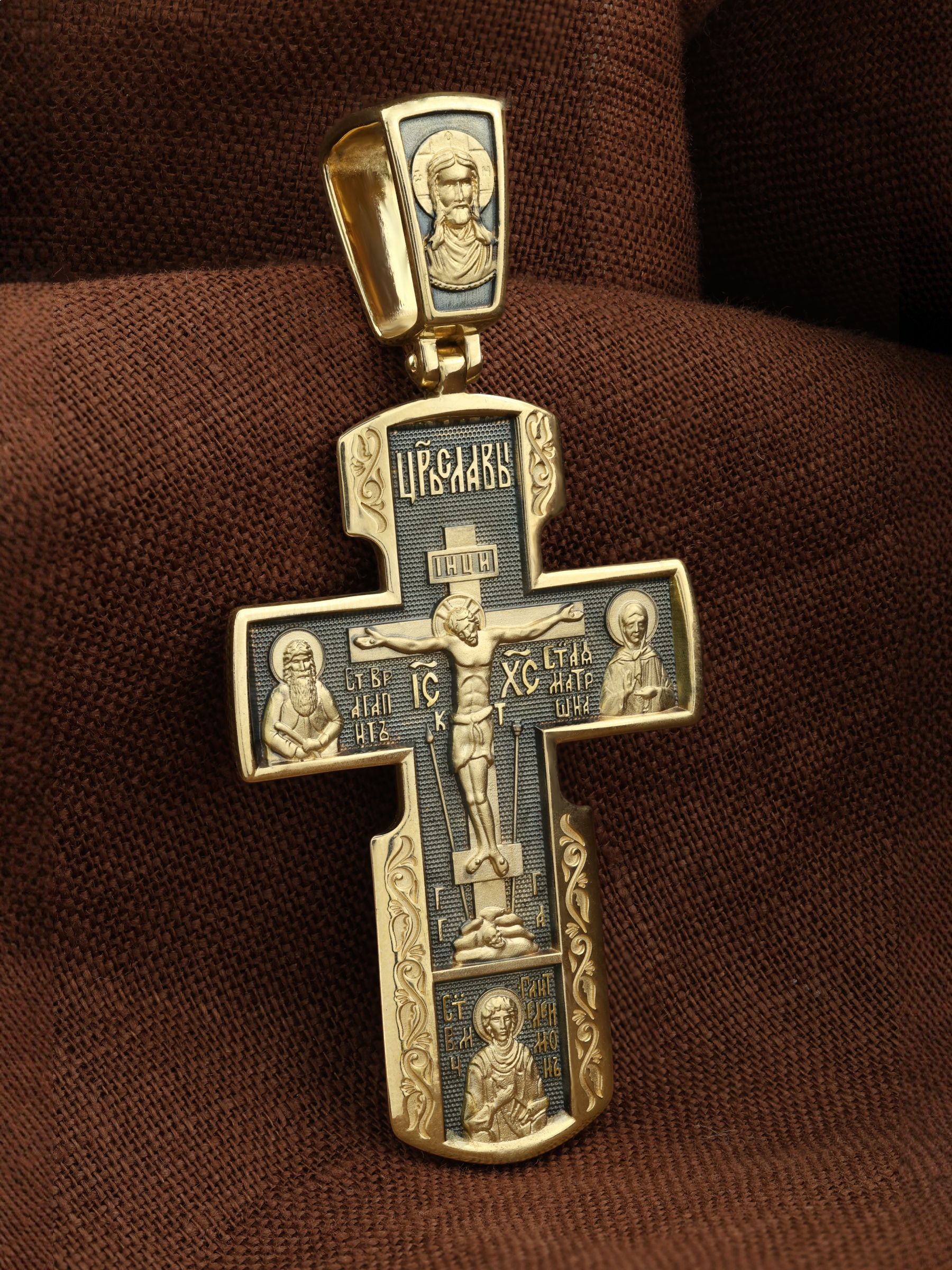 На лицевой стороне креста изображено Распятие Иисуса Христа на Голгофском Кресте. Над титлом видим слова «ЦРЬ СЛВЫ» — Царь Славы. Верхняя перекладина символизирует собой табличку с надписью «IHЦI» — Иисус Назарянин Царь Иудейский. Над перекладиной пишется сокращенно имя Спасителя «IC XC» — Иисус Христос, ниже перекладины добавляется: «НИКА» (греч. — Победитель). Возвышение, на котором стоит Крест, символизирует гору Голгофу, на которой произошло Распятие. У подножия Креста изображают прах Адама, обозначенный черепом.. Справа от Распятия помещен образ прославленной святой блаженной Матроны. «Матронушка», — ласково называют эту святую православные за удивительную любовь и помощь, которую она подает всем нуждающимся в ее поддержке. Слева — икона прп. Агапита. Этот святой жил в пещерах Киево-Печерского монастыря в XI веке и бескорыстно врачевал мирян и монахов.