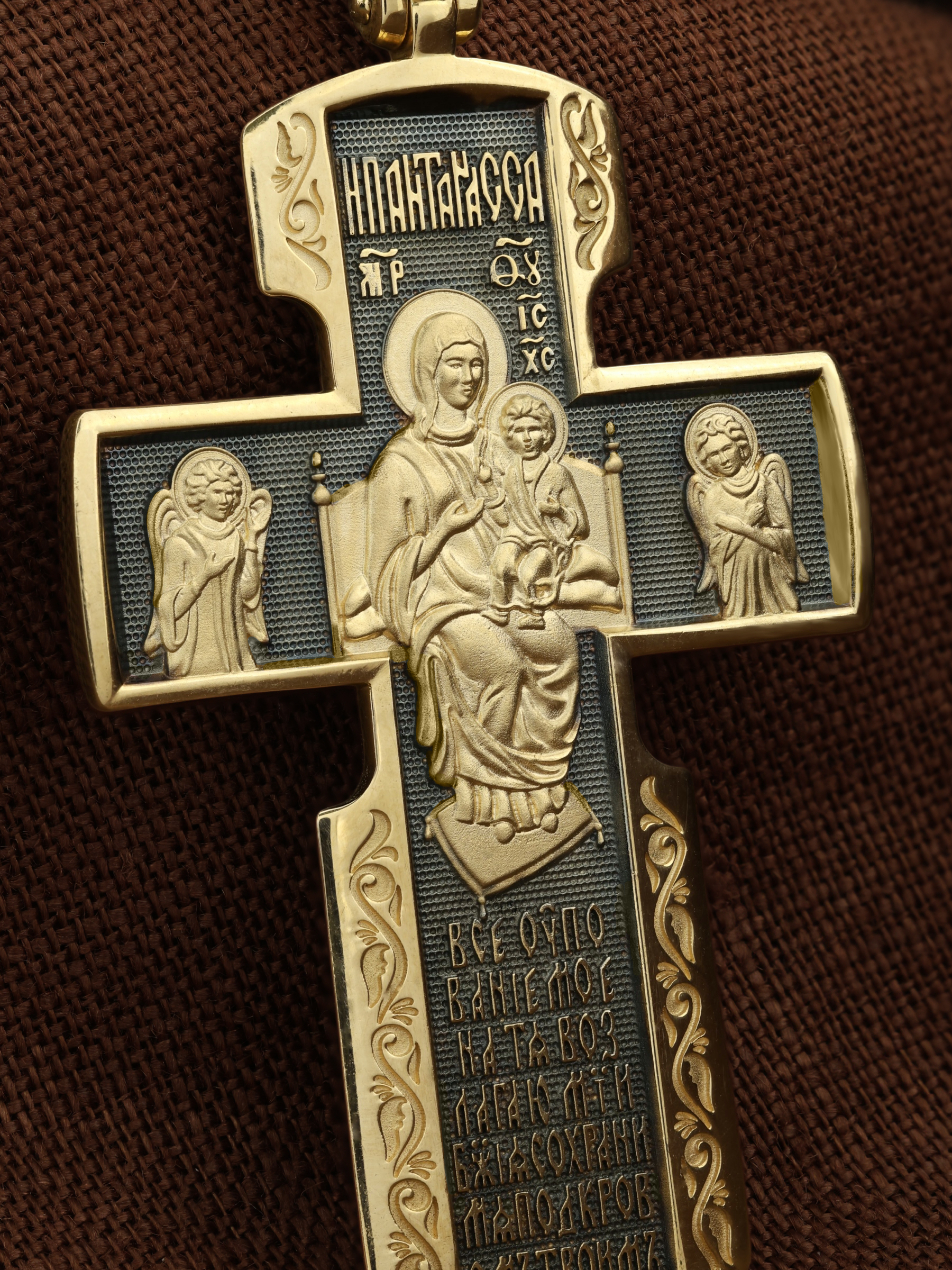 Внизу креста написана молитва обращенная к Божией Матери «Все упование мое на Тя возлагаю, Мати Божия, сохрани мя под кровом Твоим».