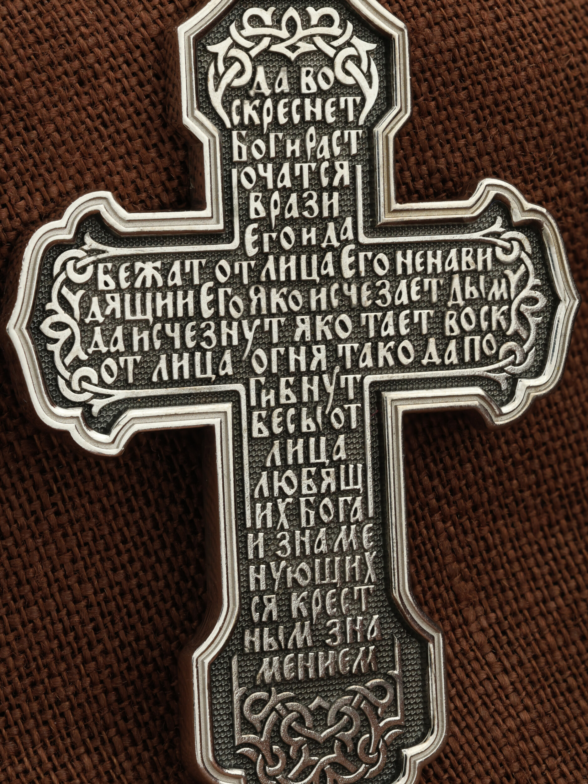 На оборотной стороне креста написана молитва Честному Кресту Господню: «Да воскреснет Бог, и расточатся врази Его, и да бежат от лица Его ненавидящии Его. Яко исчезает дым, да исчезнут; яко тает воск от лица огня, тако да погибнут беси от лица любящих Бога и знаменующихся крестным знамением…».