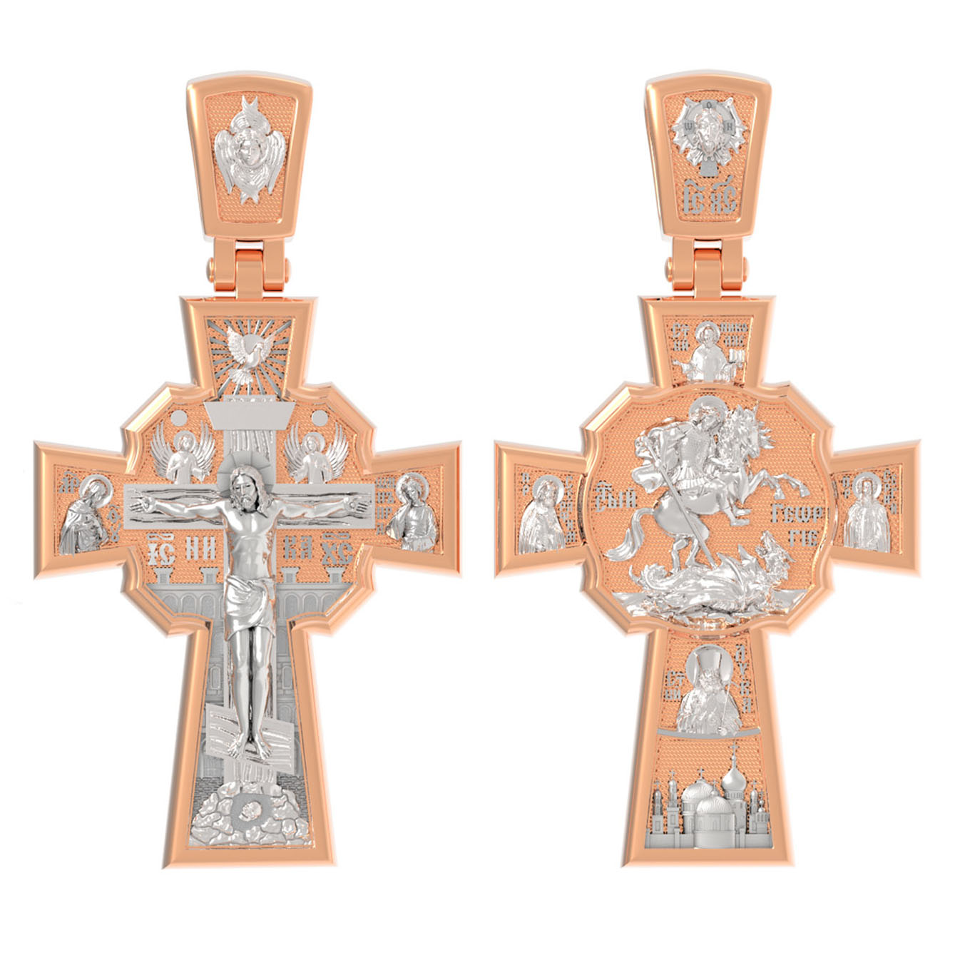 В центре оборотной стороне креста помещен образ Святого Великомученика Георгия Победоносца — одного из самых почитаемых и удивительных святых. На образке он изображен как воитель поражающий копьем огнедышащего змея. Змей символизирует собою сатанинские силы. Справа помещен образ Святого Преподобного Сергия, игумена Радонежского, чудотворца, слева — Преподобного Серафима Саровского, чудотвореца. Выше помещен образ Святителя Николая архиепископа Мир Ликийских, чудотвореца, ниже — образ святителя Луки (Войно-Ясенецкого), архиепископа Симферопольского и Крымского, исповедника и изображение Храма. На кулонном кольце изображен Спас Нерукотворный — образ Господа и Спасителя нашего Иисуса Христа, чудесно отпечатавшийся на плате, котором Христос вытер свой лик.