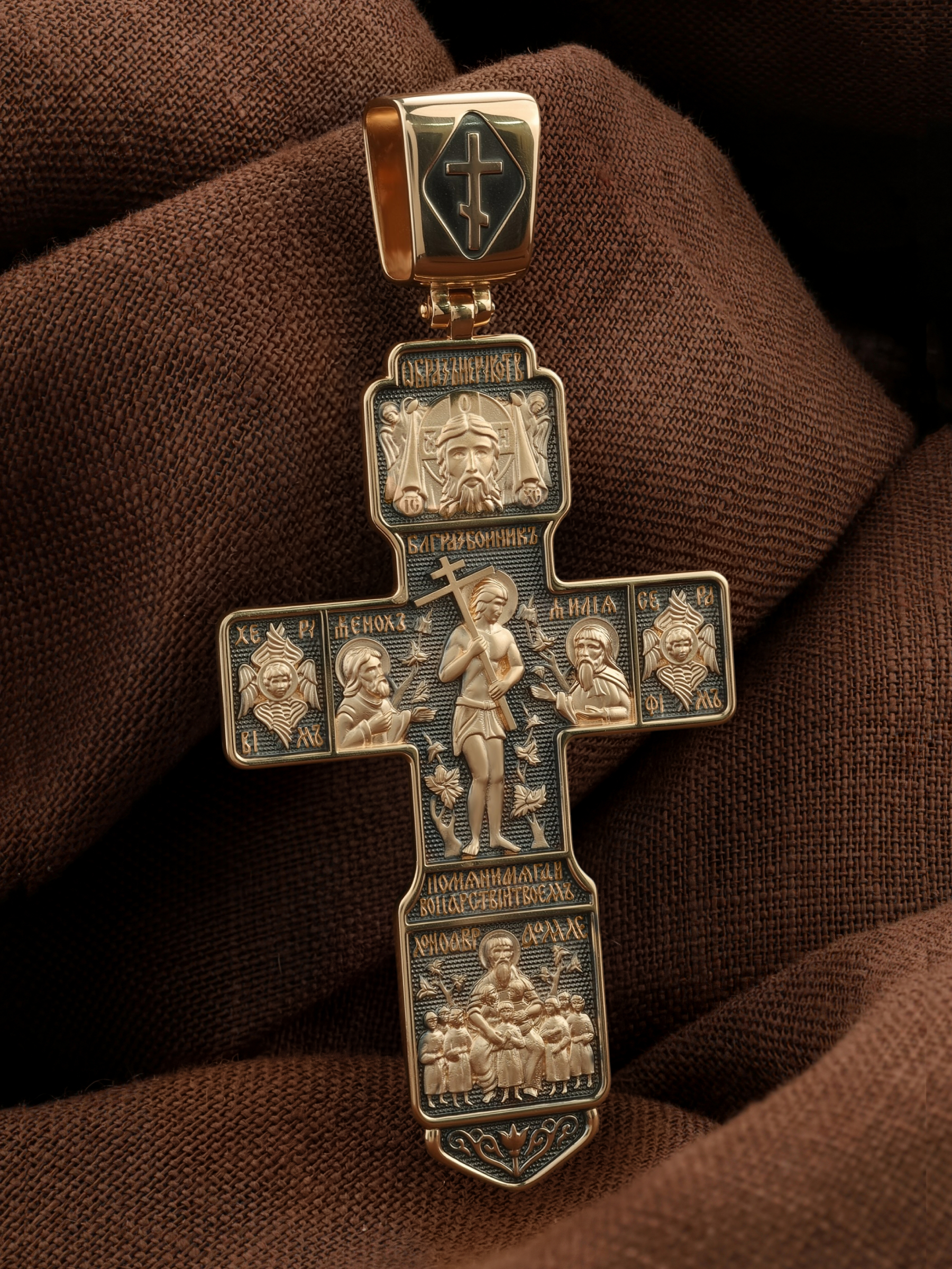 На концах горизонтальной балки креста помещены образы вселенских святителей и творцов литургии Василия Великого и Иоанна Златоуста. В кулонном кольце изображены райские врата с их стражем — Херувимом. Врата, которые открылись благодаря крестной жертве Христа.