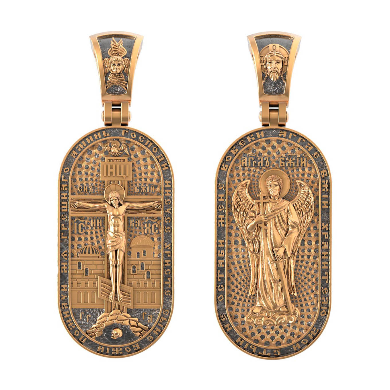 Центральную часть лицевой стороны занимает Распятие Христа — образ жертвы, принесенной Господом за грехи людей. Именно ко Христу, сошедшему на землю ради нашего спасения, возносятся все молитвы. Рядом с Его образом помещены слова — «НИКА» (греч. — Победитель) и «СЫН БОЖИЙ». Эти слова характеризуют Господа как Великого Архиерея, победителя смерти. Также Распятие сопровождается надписями, олицетворяющими Христа — это святое имя Христа «IC» (Иисус) «ХС» (Христос). Верхняя перекладина символизирует собой табличку с надписью «IHЦI» — Иисус Назарянин Царь Иудейский. Возвышение, на котором стоит Крест, символизирует гору Голгофу, на которой произошло Распятие. У подножия Креста изображают прах Адама, обозначенный черепом. На кулонном кольце изображен шестикрылый Серафим — самый приближенный к Господу Ангел. По контуру образка написана молитва: «Господи Иисусе Христе, Сыне Божий, помилуй мя грешного. Аминь»