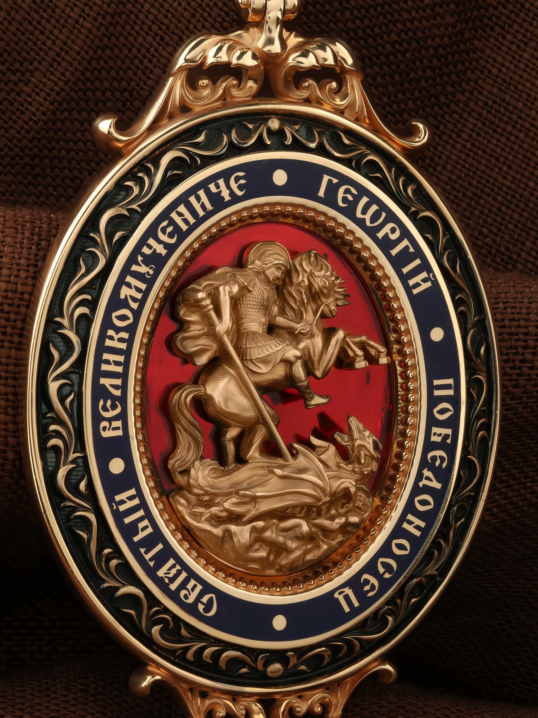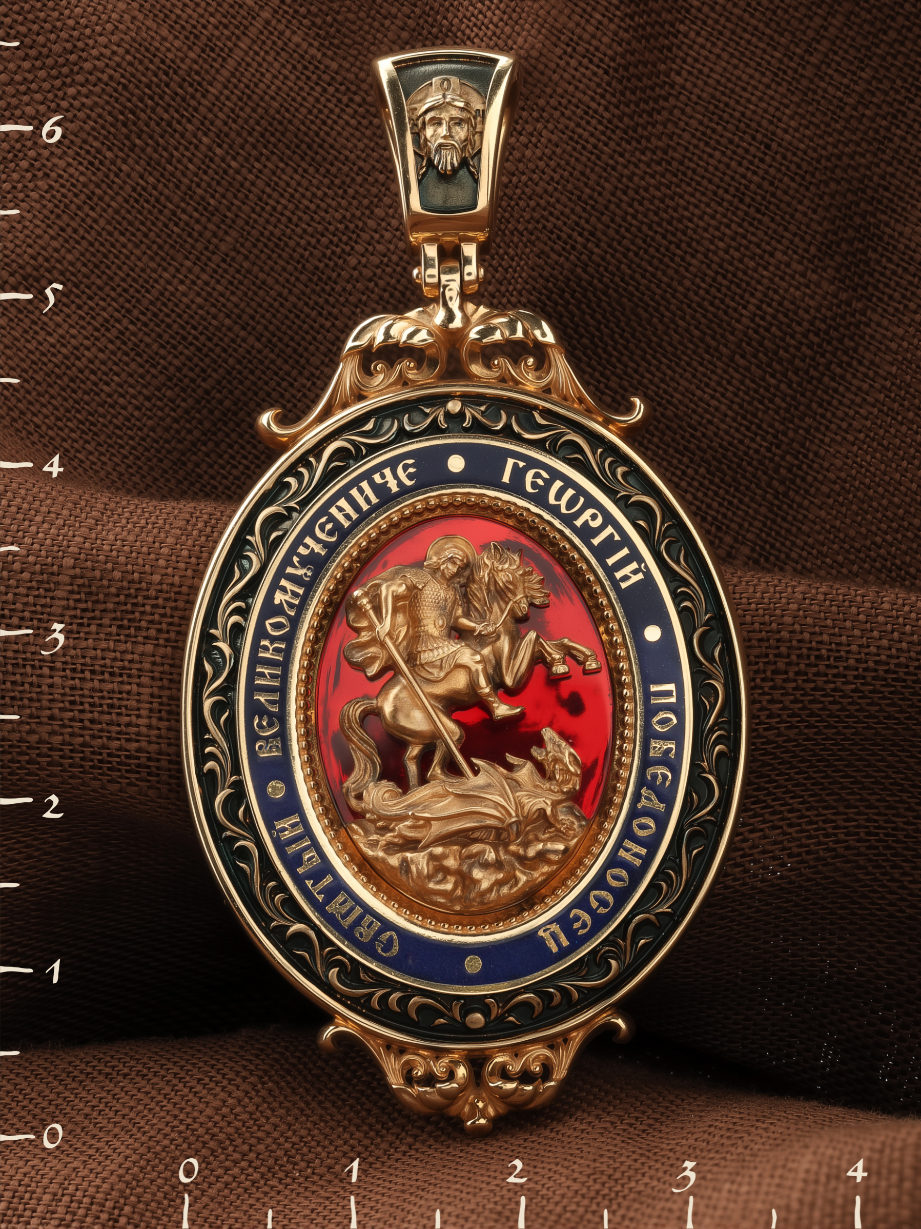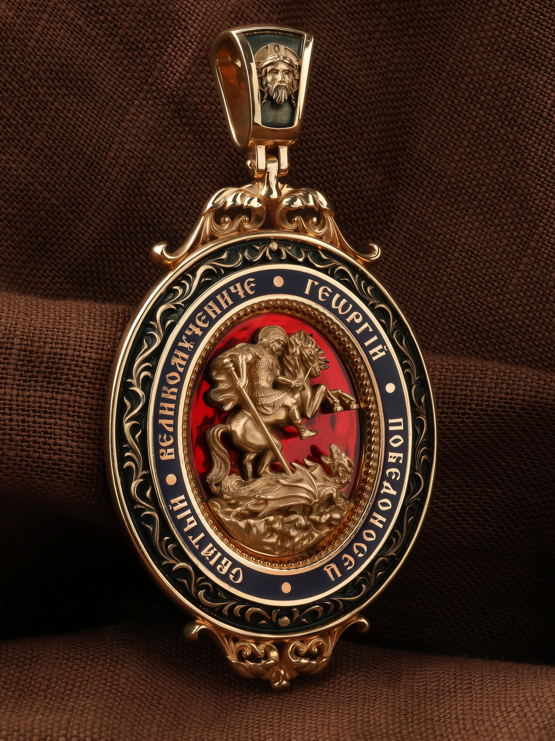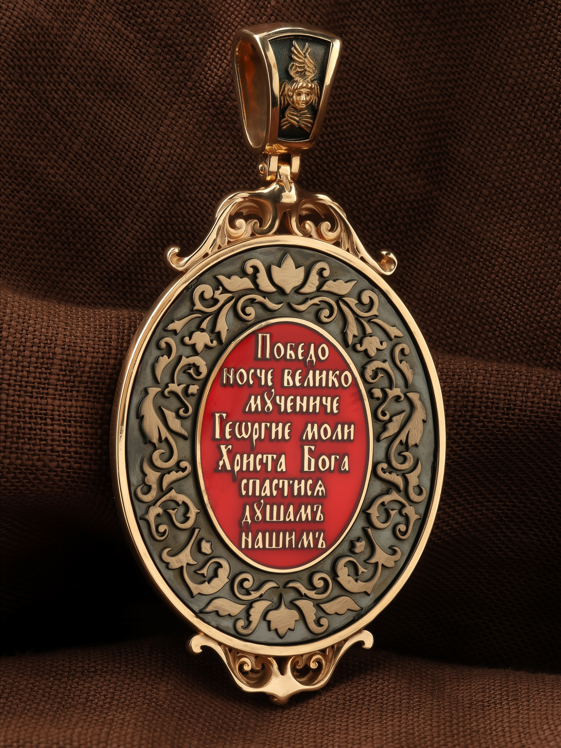 Молитва перед иконой Георгия Победоносца поможет защититься от врагов, одержать победу в сражении (военном, спортивном, духовной брани с дьяволом), содействие в установлении мира между членами семьи, избавиться от телесного недуга. На кулонном кольце изображен Спас Нерукотворный — Символ вочеловечившегося Божества и шестикрылый Серафим — самый приближенный к Господу Ангел.