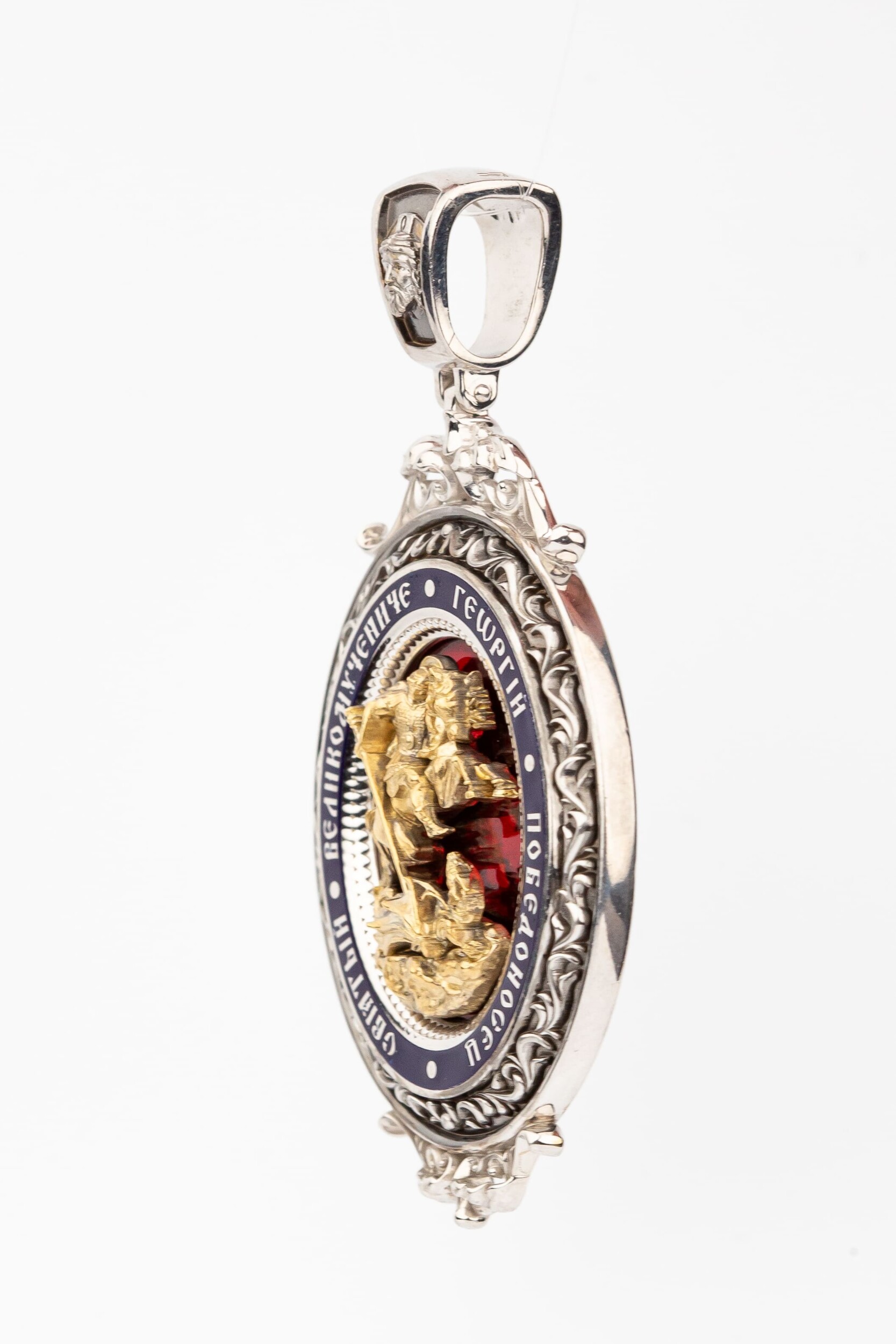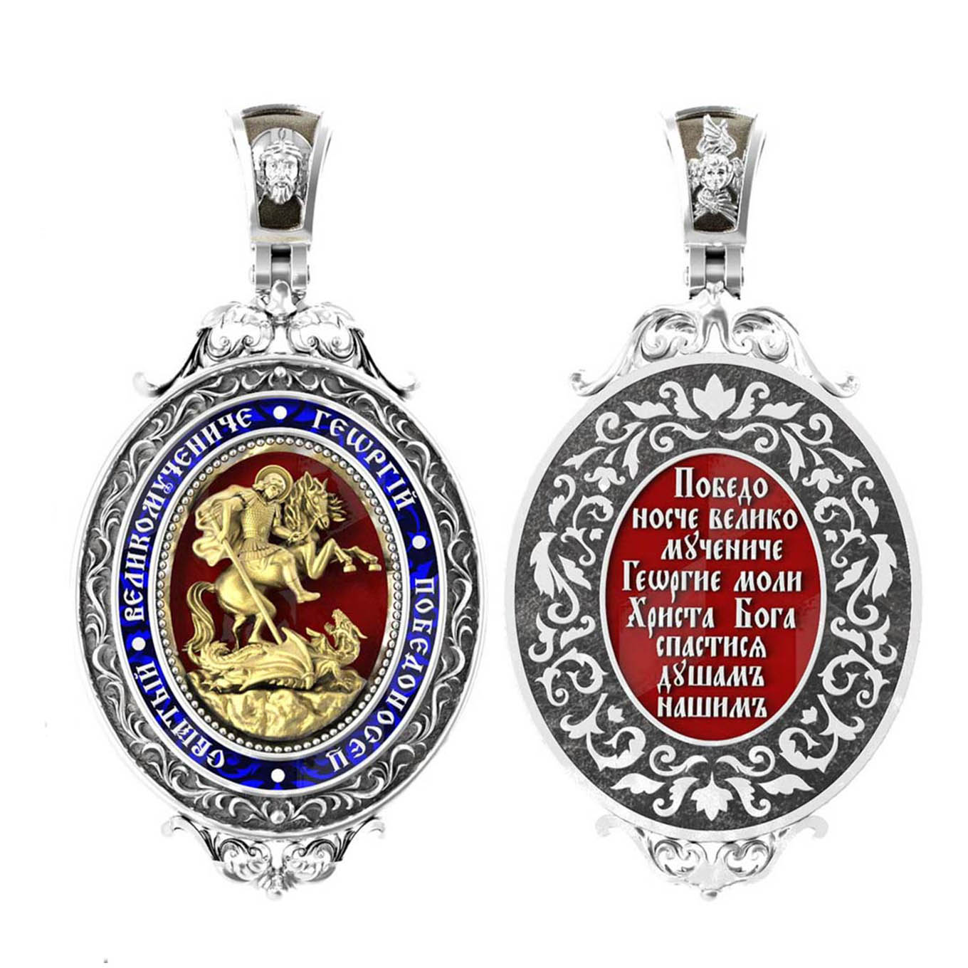 Молитва перед иконой Георгия Победоносца поможет защититься от врагов, одержать победу в сражении (военном, спортивном, духовной брани с дьяволом), содействие в установлении мира между членами семьи, избавиться от телесного недуга. На кулонном кольце изображен Спас Нерукотворный — Символ вочеловечившегося Божества и шестикрылый Серафим — самый приближенный к Господу Ангел.