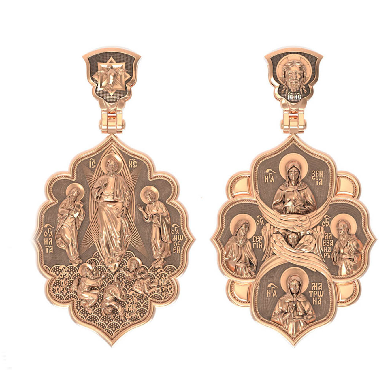 На лицевой стороне образка изображена икона «Преображение». Образ являет Господа Иисуса Христа в тот момент, когда Он преобразился во время молитвы перед тремя Своими учениками: Петром, Иаковом и Иоанном Богословом. Пророки Моисей и Илия предстояли рядом и беседовали с Ним. Апостолы едва могли вынести бесконечную радость, которая охватила их в присутствии Бога. Когда же на гору спустилось облако и раздался глас Божий: «Сей есть Сын Мой Возлюбленный; Его слушайте», апостолы в сильном страхе пали на землю (Лк. 9:35). На иконах «Преображение» они так и изображаются — лежащими у ног Христа.
