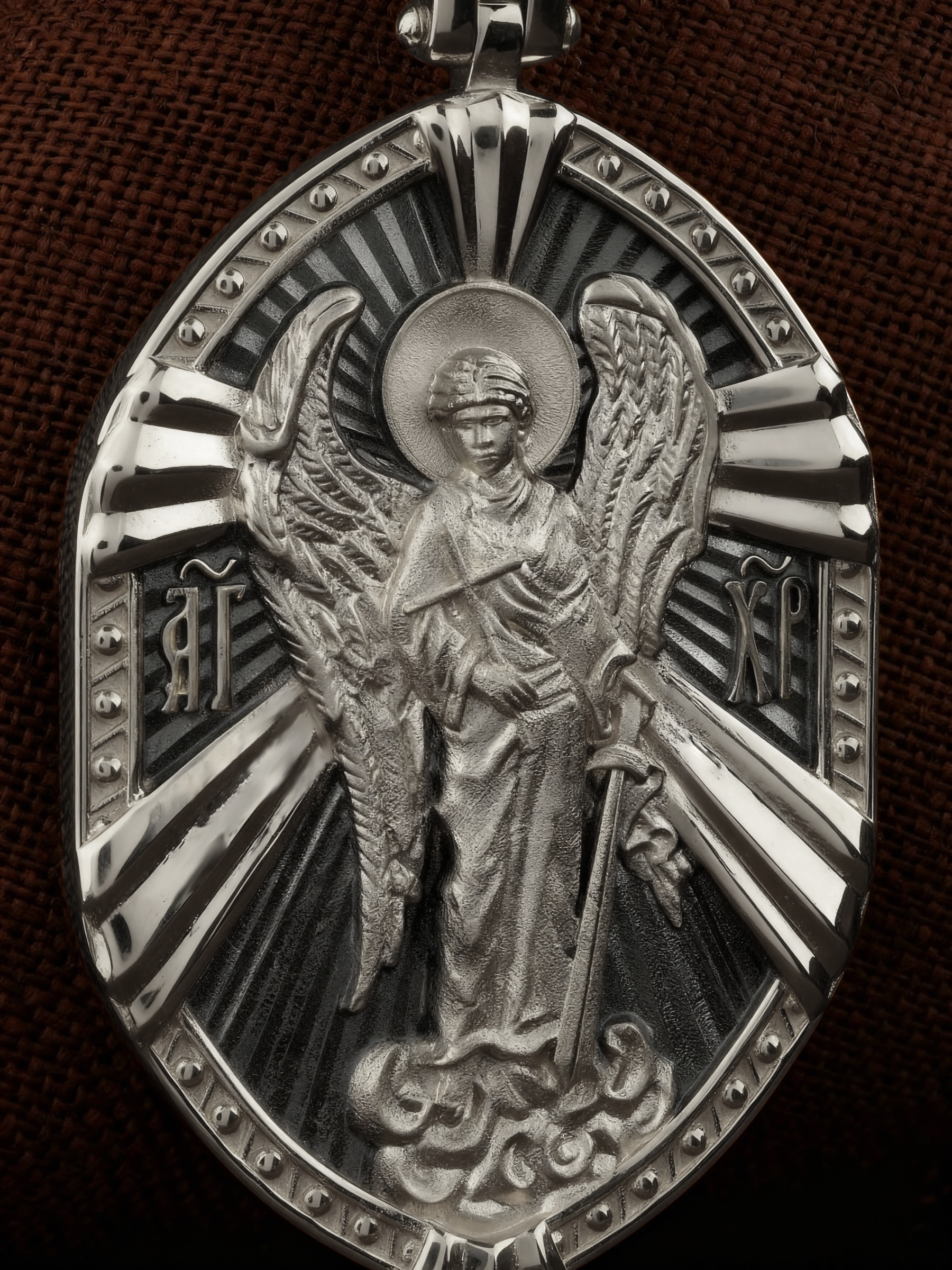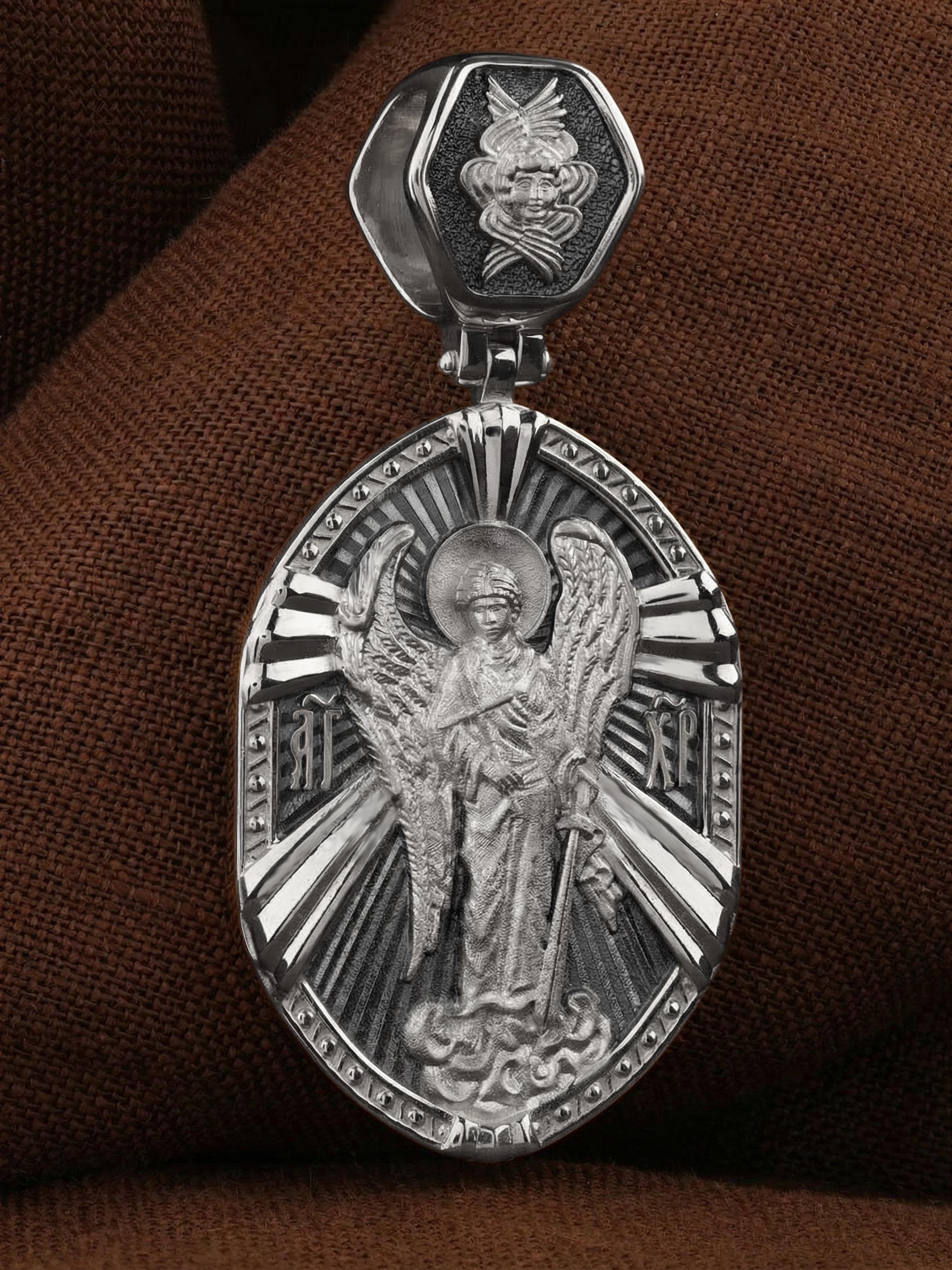 На оборотной стороне креста изображена прямостоящая фигура Ангела Хранителя с традиционными атрибутами в руках: крестом, которым он осеняет человека, и мечом для прогнания бесов. По Православному учению, каждому, принявшему святое крещение, дается Господом Ангел Хранитель, который сопровождает человека всю его жизнь, помогая в добрых делах и охраняя от нападок злых духов. Святые отцы утверждают, что только верующий человек имеет рядом с собой Ангела Хранителя: «Тем, которые сподобились крещения и возносятся на высоту добродетелей, даны от Бога Ангелы, заботящиеся о них и содействующие им. В этом уверяет нас Господь, когда говорит, что есть Ангелы Хранители у всякого, кто верует в Него» (преп. Анастасий Синаит). Но Ангел Хранитель пребывает с христианином, если только мы не прогоним его греховными делами, поскольку «как дым разгоняет пчел, так и грех прогоняет от нас Ангела Хранителя» (свт. Василий Великий). Но и после завершения земного пути Ангел Хранитель не покидает христианина, а помогает душе преодолеть воздушные мытарства на пути в Царство Небесное.