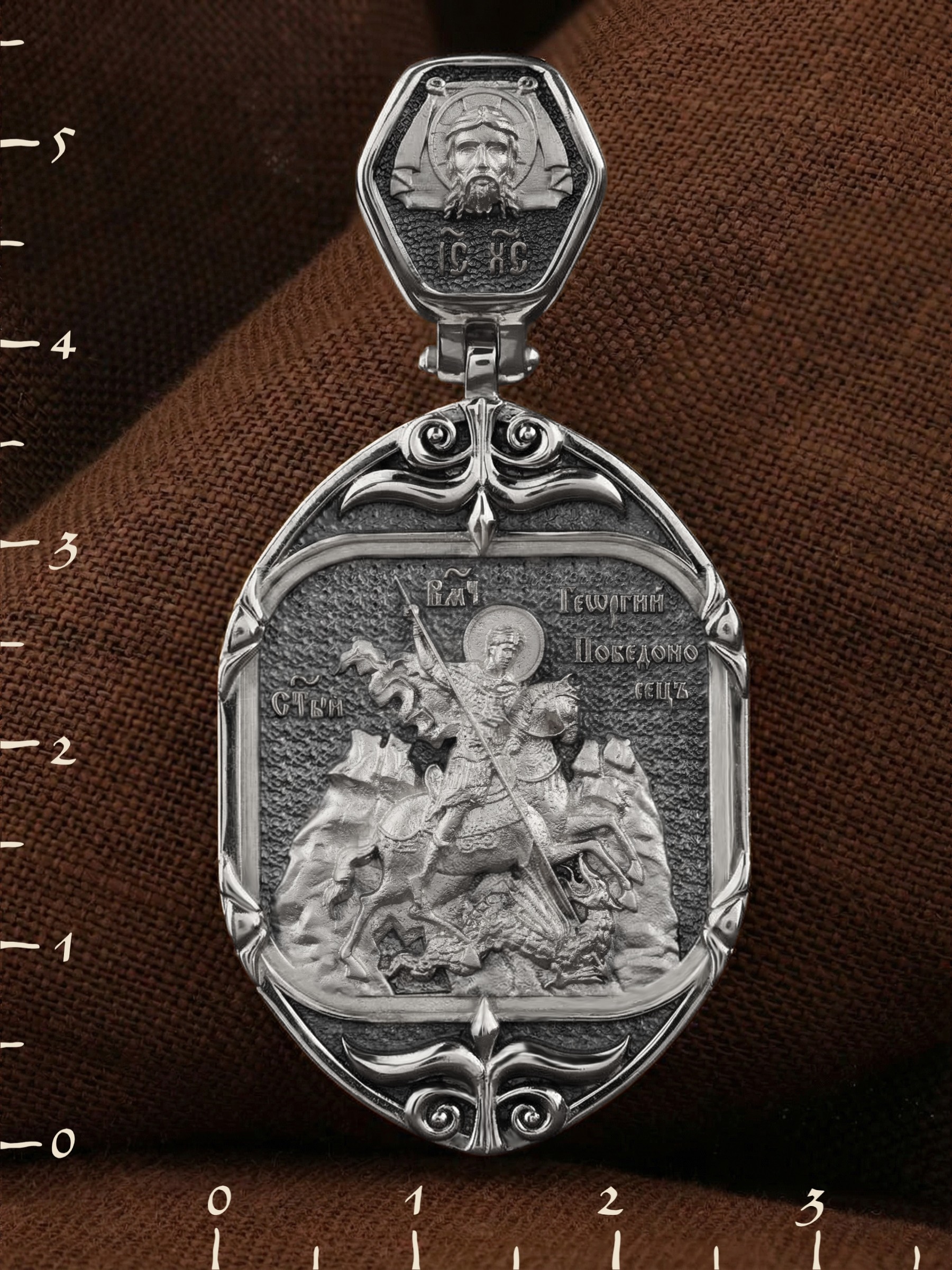 Основой композиции лицевой стороны является изображение Святого Георгия Победоносца. Святой Георгий — один из наиболее почитаемых святых в Христианской Церкви. На Руси он известен как Юрий или Егорий, покровитель воинов, помощник в крестьянском труде. На образке изображено самое знаменитое чудо святого: спасение принцессы от змея, которому она предназначалась в жертву. Чудо это имеет символическое толкование. Принцесса означает душу человеческую, а змей — дьявола, желающего ее поглотить. Св. Георгий, небесный защитник, спускается с Небес, чтобы помочь душе избавиться от гибели.