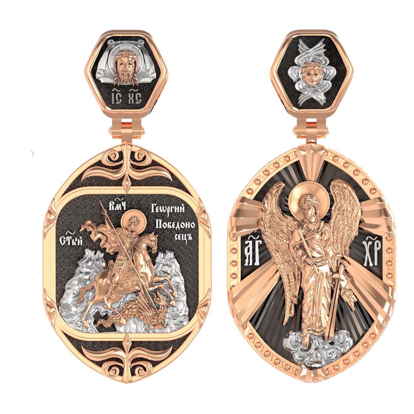 Основой композиции лицевой стороны является изображение Святого Георгия Победоносца. Святой Георгий — один из наиболее почитаемых святых в Христианской Церкви. На Руси он известен как Юрий или Егорий, покровитель воинов, помощник в крестьянском труде. На образке изображено самое знаменитое чудо святого: спасение принцессы от змея, которому она предназначалась в жертву. Чудо это имеет символическое толкование. Принцесса означает душу человеческую, а змей — дьявола, желающего ее поглотить. Св. Георгий, небесный защитник, спускается с Небес, чтобы помочь душе избавиться от гибели.
