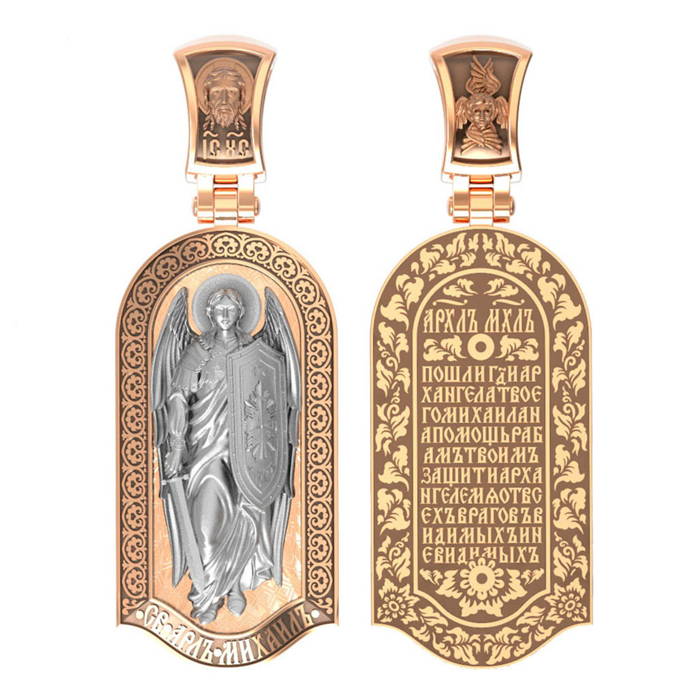 Основой композиции лицевой стороны является ростовое изображение Архангела Михаила — Архистратига всех Небесных Воинств. Он ведет непримиримую войну против сил зла, охраняет райские врата и защищает души людей. Его имя означает «Кто яко Бог?», так как он самый могучий и грозный враг зла. Он первым ополчился на Денницу, когда тот восстал против Бога, низверг его с Неба и не перестает сражаться с его темным воинством. Поэтому он часто изображается в виде воина, в доспехах и с огненным мечом. Но как служитель Небесного Царя и глава Ангелов и Архангелов на многих иконах он предстает в богатой одежде византийских придворных.
