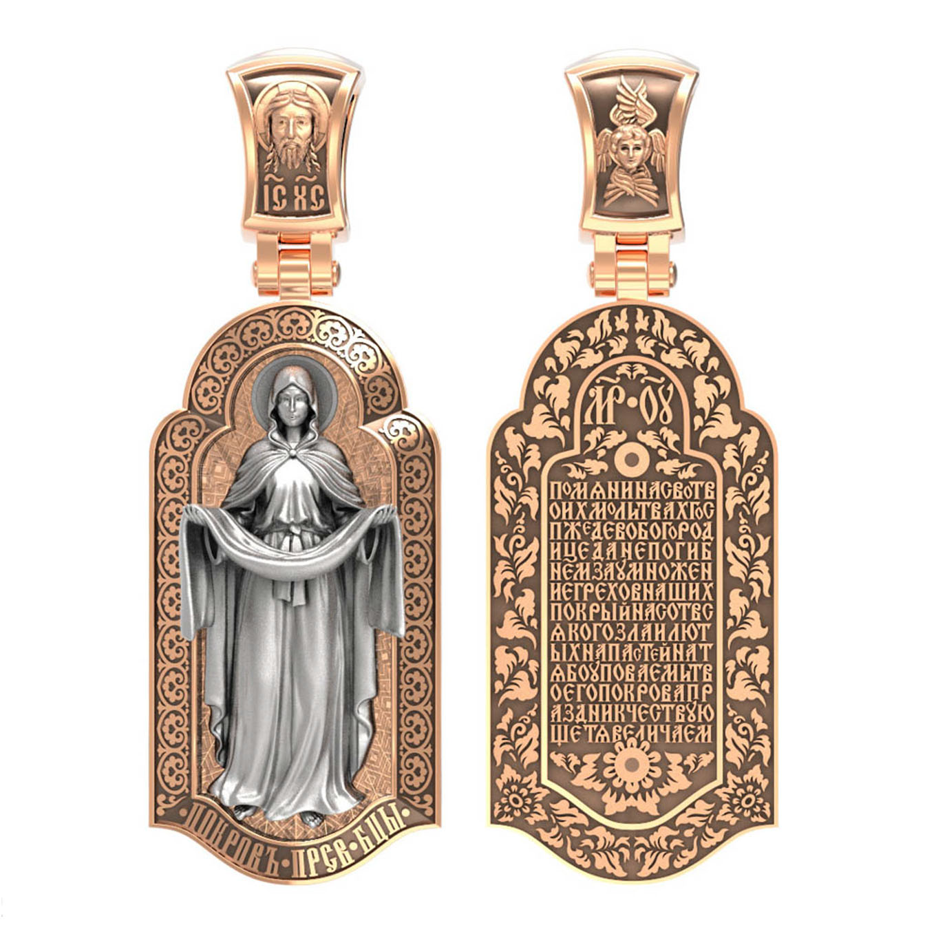 На лицевой части образка изображена икона Покров Пресвятой Богородицы. Праздник Покрова Божией Матери является воспоминанием чуда, которое произошло во Влахнернской церкви 1 (14) октября 910 года: Пресвятая Богородица явилась верующим над алтарем храма и распростерла над ними Свое покрывало. В этот день Божья Матерь открыла людям, что Она является Ходатаицей за них перед Богом. Богородица простирает Свой молитвенный покров над всеми православными христианами и умоляет Сына Своего о даровании вечного спасения каждому человеку.