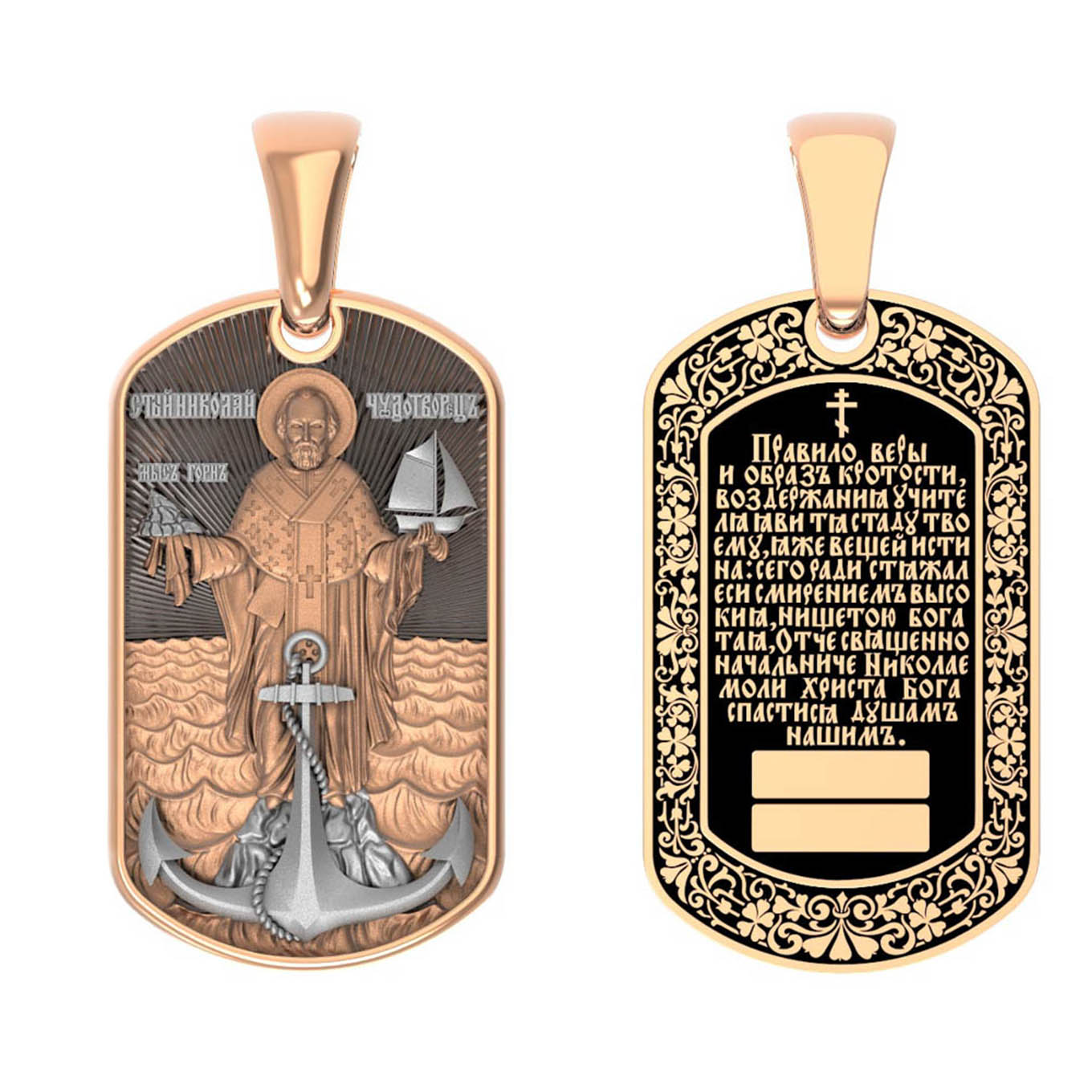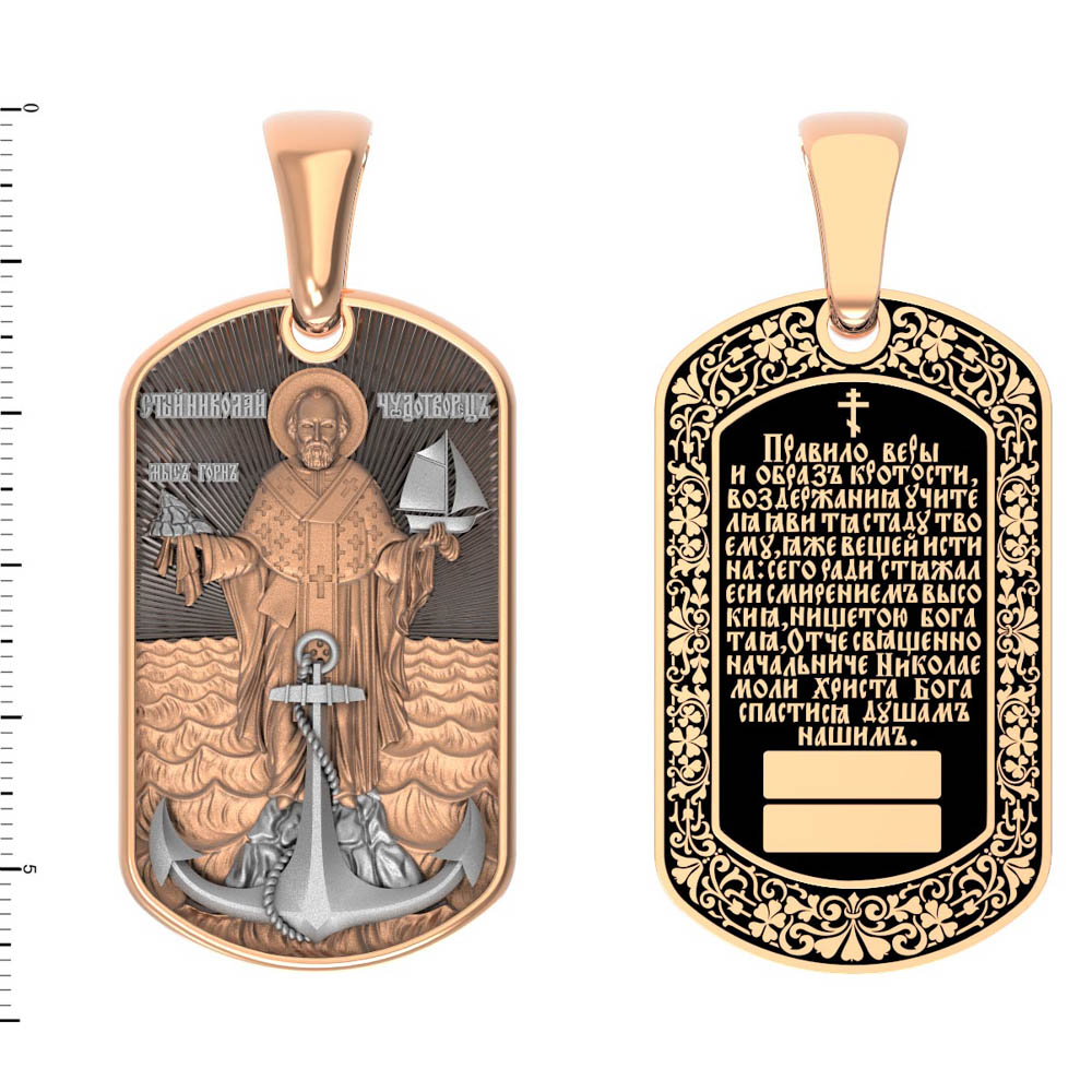 Лицевую сторону возглавляет икона Святителя Николая Чудотворца. Живший в III веке епископ Ликийского города Миры — самый почитаемый святой не только в России, но и во всем мире. Николай Чудотворец, помощник в делах, покровитель учащихся, утешитель обиженных и нуждающихся, целитель самых страшных и тяжелых недугов, предстатель и молитвенник за людей перед Богом. Также Святитель Николай Чудотворец известен своими молитвами за путешественников, когда непрестанный ветер и бушующие волны утихают и корабль заходит в спокойную гавань.