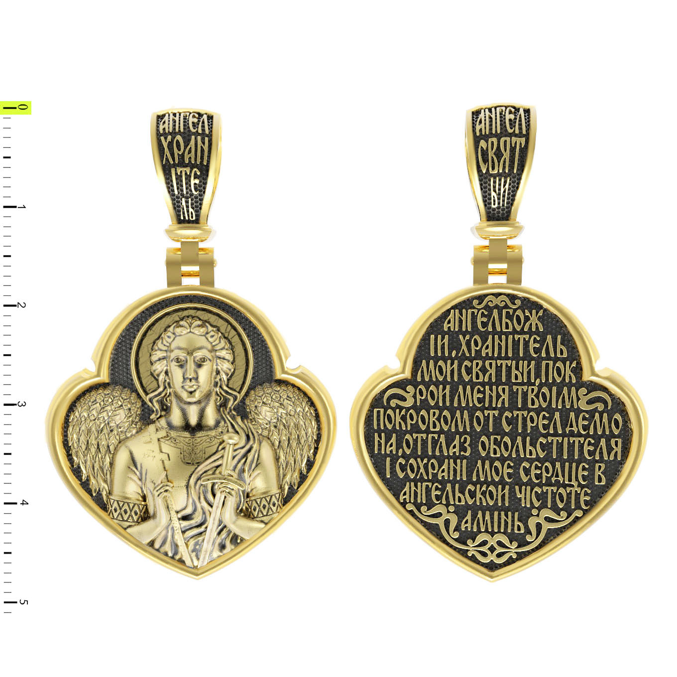 На лицевой стороне образка изображен Святой Ангел-Хранитель в виде прекрасного, светозарного юноши держащего в правой руке крест, а в левой — мечь. А? нгел-Хранитель — это Ангел приставляемый Богом к человеку при крещении для охраны и помощи в добрых делах. Он невидимо находится при человеке на протяжении всей его жизни, если человек сохраняет в себе любовь к Богу и истинную веру перед Ним. Ангел-Xранитель делают для нас все, что служит к истинному нашему благу и спасению. Невидимо пребывая при нас постоянно, он, руководствуя нас ко спасению, не только по нашему желанию таинственно наставляет нас на все доброе и полезное, не только возносит наши молитвы к Богу, но еще и сам от себя охраняют и защищают нас от врагов видимых и невидимых и ходатайствует за нас пред Богом.