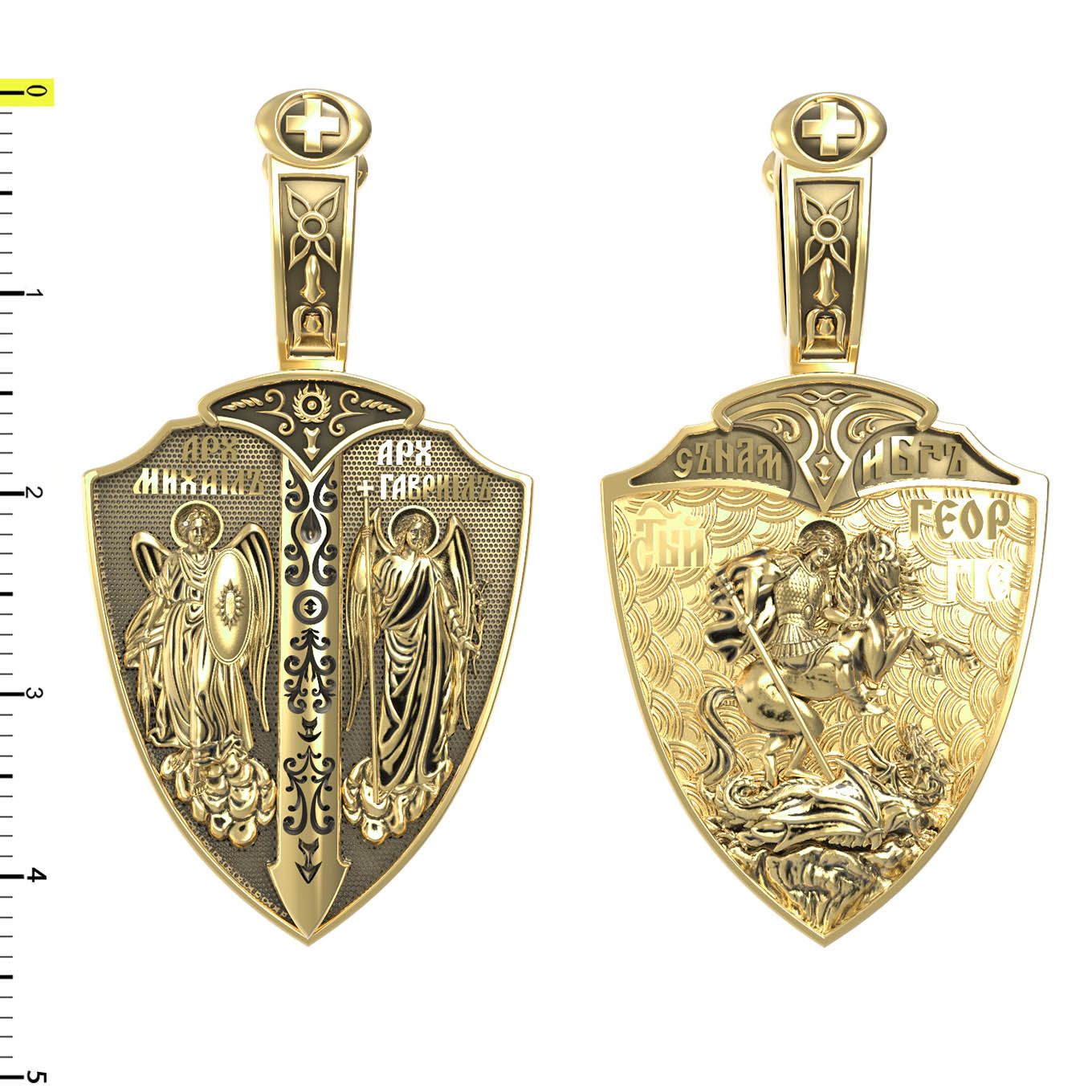 Образок выполнен в виде воинского щита и меча. На лицевой стороне образка изображены Архангел Михаил и Архангел Гавриил. Архангел Михаил изображен в воинственном виде с огненным мечом в правой руке и щитом в левой руке. Архангел Михаил — верный служитель Божий, который низринул с Неба возгордившегося денницу с другими павшими духами. В Православии его называют Архистратигом, что означает глава святого воинства Ангелов и Архангелов. Архангел почитается как покровитель воинов и всех верных Богу и ведущих борьбу против сил зла, борец против ересей, а также защитник душ умерших, страж райских врат. Архангел Гавриил изображен с крестом в правой руке и цветком лилии в левой руке. Он несколько раз упоминается в Писании, как Небесный вестник, которого Бог посылает, чтобы возвестить людям Свои планы о спасении рода человеческого. Так, Архангел Гавриил несколько раз являлся пророку Даниилу и раскрывал ему тайны пришествия Мессии, гонений антихриста и конца мира (Дан. 8, 16, 9−21). Перед пришествием Сына Божия в мир архангел Гавриил явился в храме старцу Захарии и сообщил ему о чудесном зачатии Предтечи. Через шесть месяцев он явился в Назарете Деве Марии с вестью об избрании Ее быть Матерью Христа Спасителя (Лк. 1). Когда Господь перед Своими страданиями молился в Гефсиманском саду до кровавого пота, на укрепление Его, по Церковному Преданию, был послан с Небес Архангел Гавриил. (Лк.22:43). Жены мироносицы услышали от Архистратига радостную весть о Воскресении Христовом.