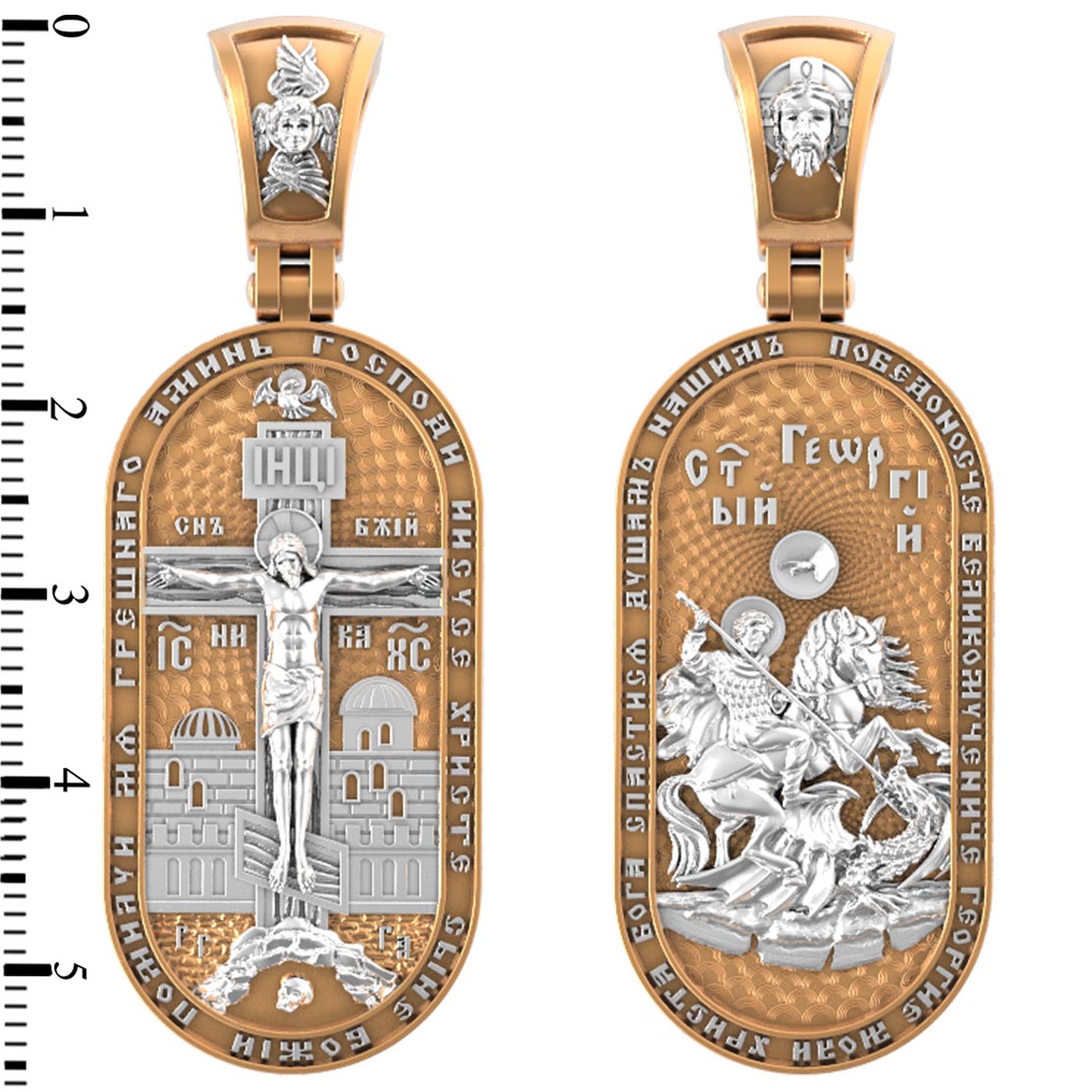 По контуру написана молитва: «Победоносче Великомучениче Георгие, моли Христа Бога спастися душам нашим». На кулонном кольце изображен Спас Нерукотворный — Символ вочеловечившегося Божества.