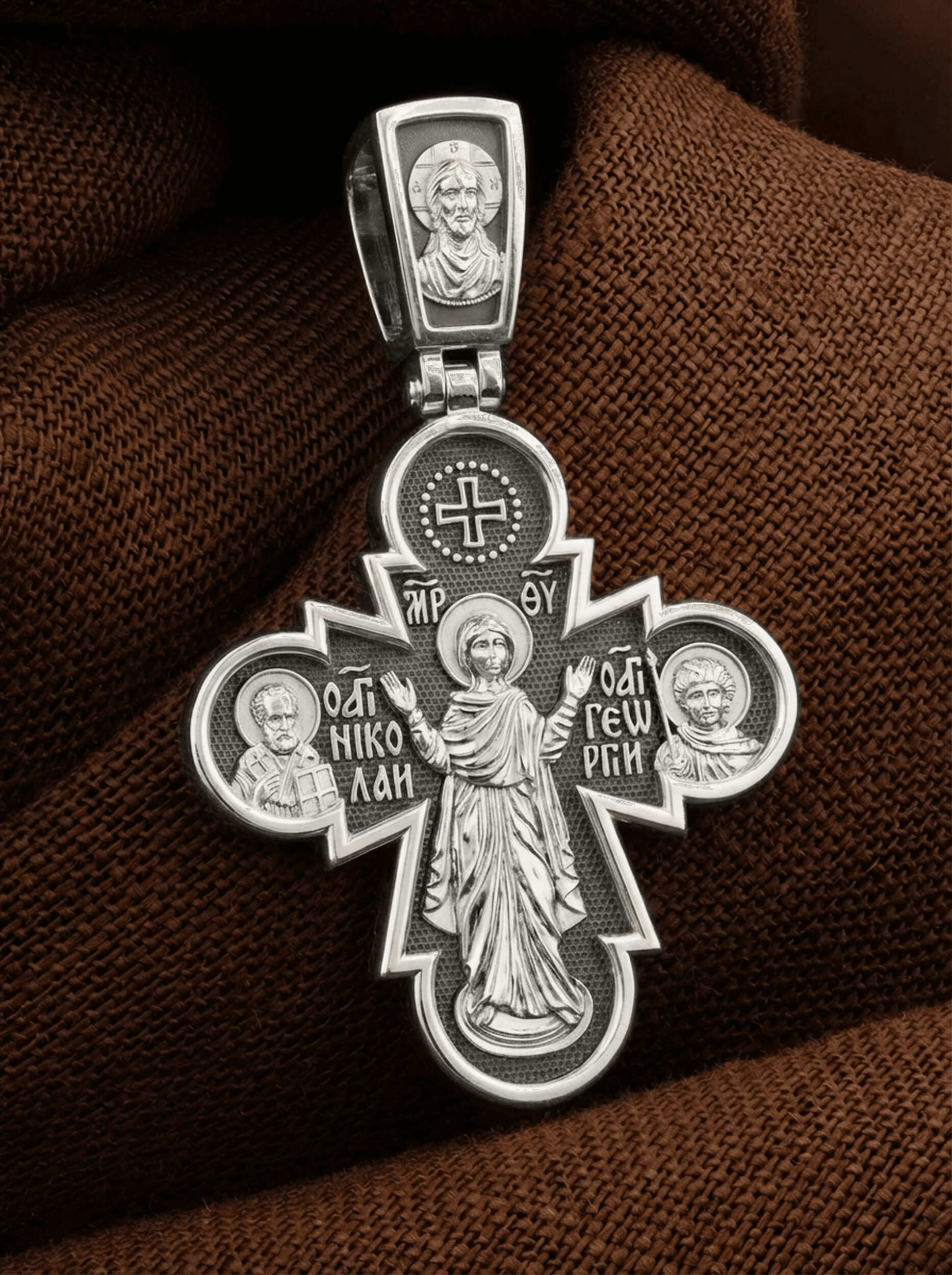 Центральную часть оборота креста занимает икона Божьей Матери «Нерушимая Стена». Особенно почитается эта икона как помощница в тяжелых жизненных ситуациях, как защитница от врагов и спасительница в смертельной опасности. Слева от Божьей Матери расположен образ Святого Николая Чудотворца. Ему молятся, отправляясь в путешествие, особенно по морю, просят исцеления в различных недугах, помощи в торговых делах, учебе и поисках достойного супруга. Справа — святой великомученик Георгий Победоносец († 303), один из наиболее почитаемых святых в Христианской Церкви. Покровитель воинов, помощник в крестьянском труде, защитник в бедах, духовный помощник в невидимой брани с силами зла. Святой Георгий, небесный защитник, который спускается с Небес, чтобы помочь душе избавиться от гибели.