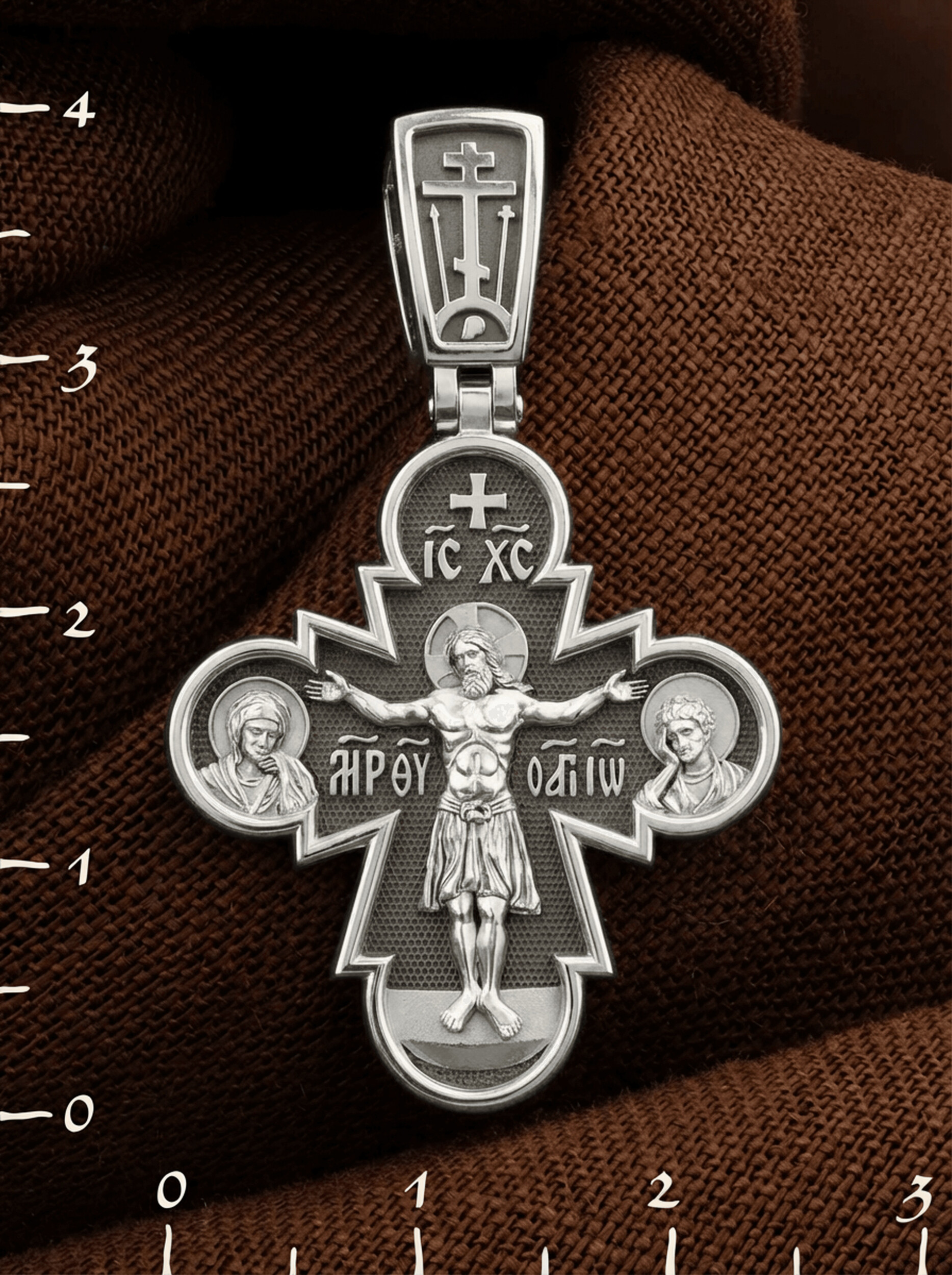 На лицевой стороне этого креста Иисус Христос является как Господь, Творец мира и его Грозный Судия, царящий на Небесах. Православная иконография показывает нам распятого Господа не в виде мучительно умирающего человека, а как величественного и всесильного Бога, который простирает руки, словно обнимает весь мир. Человеческие страдания Господа обычно только обозначаются наклоном Его головы и полузакрытыми глазами. С двух сторон Христу предстоят Пресвятая Богородица и Святой апостол и Евангелист Иоанн Богослов.