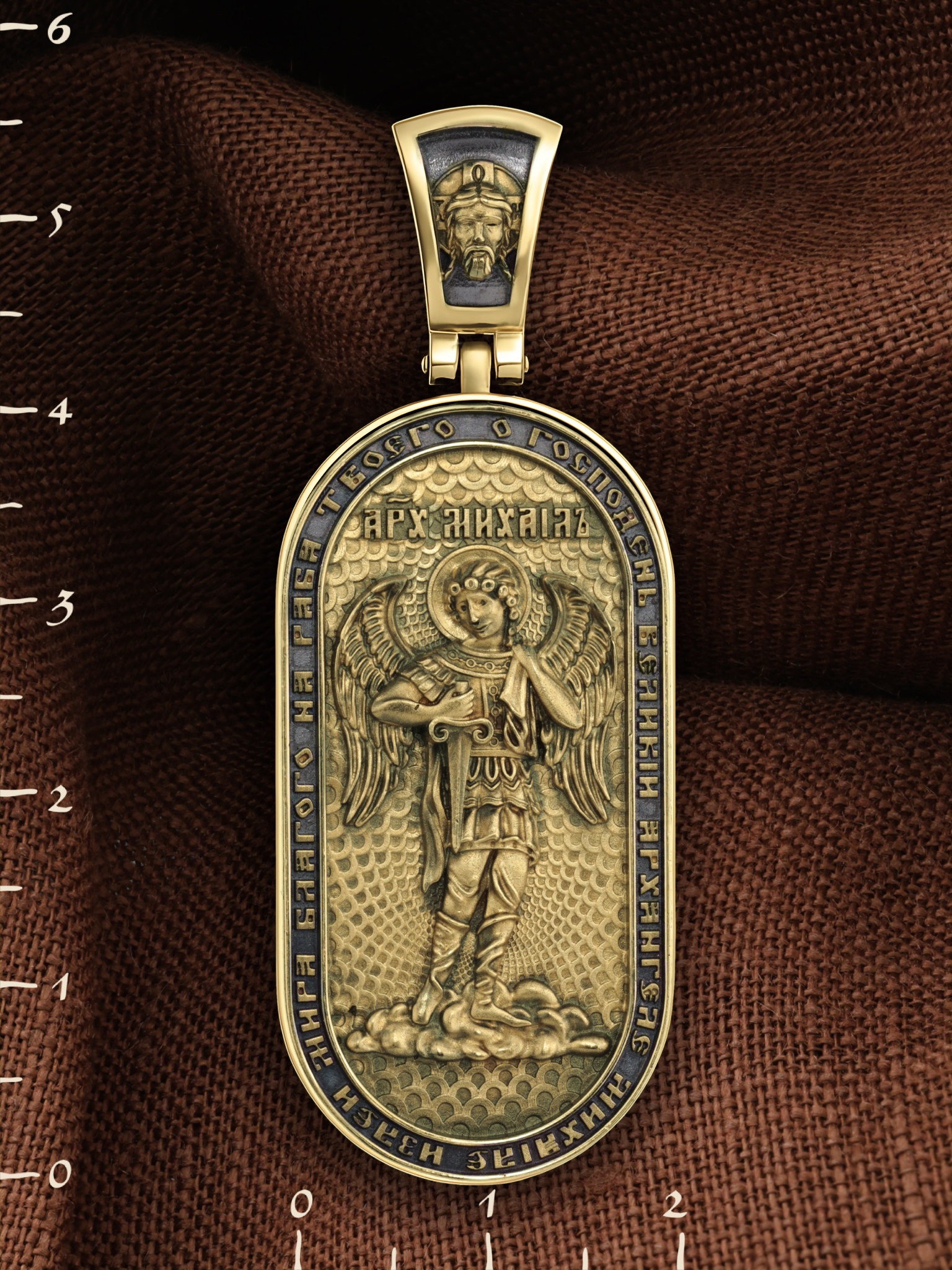 Основой композиции оборотной стороны является ростовое изображение Архангела Михаила — Архистратига всех Небесных Воинств. Он ведет непримиримую войну против сил зла, охраняет райские врата и защищает души людей. По контуру написана молитва: «О, Господень Великий Архангеле Михаиле, излей мира благого на раба Твоего». На кулонном кольце изображен Спас Нерукотворный — Символ вочеловечившегося Божества.