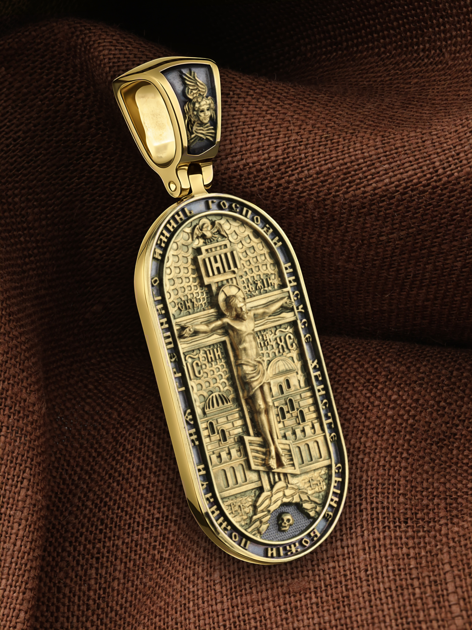 Центральную часть лицевой стороны занимает Распятие Христа — образ жертвы, принесенной Господом за грехи людей. Именно ко Христу, сошедшему на землю ради нашего спасения, возносятся все молитвы. Рядом с Его образом помещены слова — «НИКА» (греч. — Победитель) и «СЫН БОЖИЙ». Эти слова характеризуют Господа как Великого Архиерея, победителя смерти. Также Распятие сопровождается надписями, олицетворяющими Христа — это святое имя Христа «IC» (Иисус) «ХС» (Христос). Верхняя перекладина символизирует собой табличку с надписью «IHЦI» — Иисус Назарянин Царь Иудейский. Возвышение, на котором стоит Крест, символизирует гору Голгофу, на которой произошло Распятие. У подножия Креста изображают прах Адама, обозначенный черепом. На кулонном кольце изображен шестикрылый Серафим — самый приближенный к Господу Ангел. По контуру образка написана молитва: «Господи Иисусе Христе, Сыне Божий, помилуй мя грешного. Аминь»
