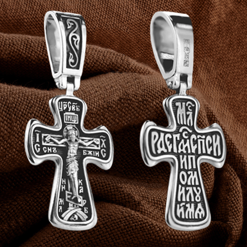 На лицевой стороне креста изображено Распятие, потому что это орудие казни Иисус Христос сделал орудием победы над грехом и смертью. Своими страданиями Он искупил грехи человечества, умерев и сошествовав во ад, победил сатану, освободил души праведников от вечной смерти и открыл им небесные врата рая. Жертва Христа сделала возможным спасение для каждого человека. На православном кресте Христос не умирает, а свободно простирает руки, ладони Иисуса открыты, будто он хочет обнять все человечество, даря им свою любовь и открывая путь к вечной жизни. Над титлом видим слова «ЦРЬ СЛВЫ» — Царь Славы. Верхняя перекладина символизирует собой табличку с надписью «IHЦI» — Иисус Назарянин Царь Иудейский. Возле перекладины пишется сокращенно имя Спасителя «IC XC» — Иисус Христос, ниже перекладины добавляется: словосочетание «СНЪ БЖІЙ» — Сын Божий и «НИКА» (греч. — Победитель). Возвышение, на котором стоит Крест, символизирует гору Голгофу, на которой произошло Распятие. У подножия Креста изображают прах Адама, обозначенный черепом.