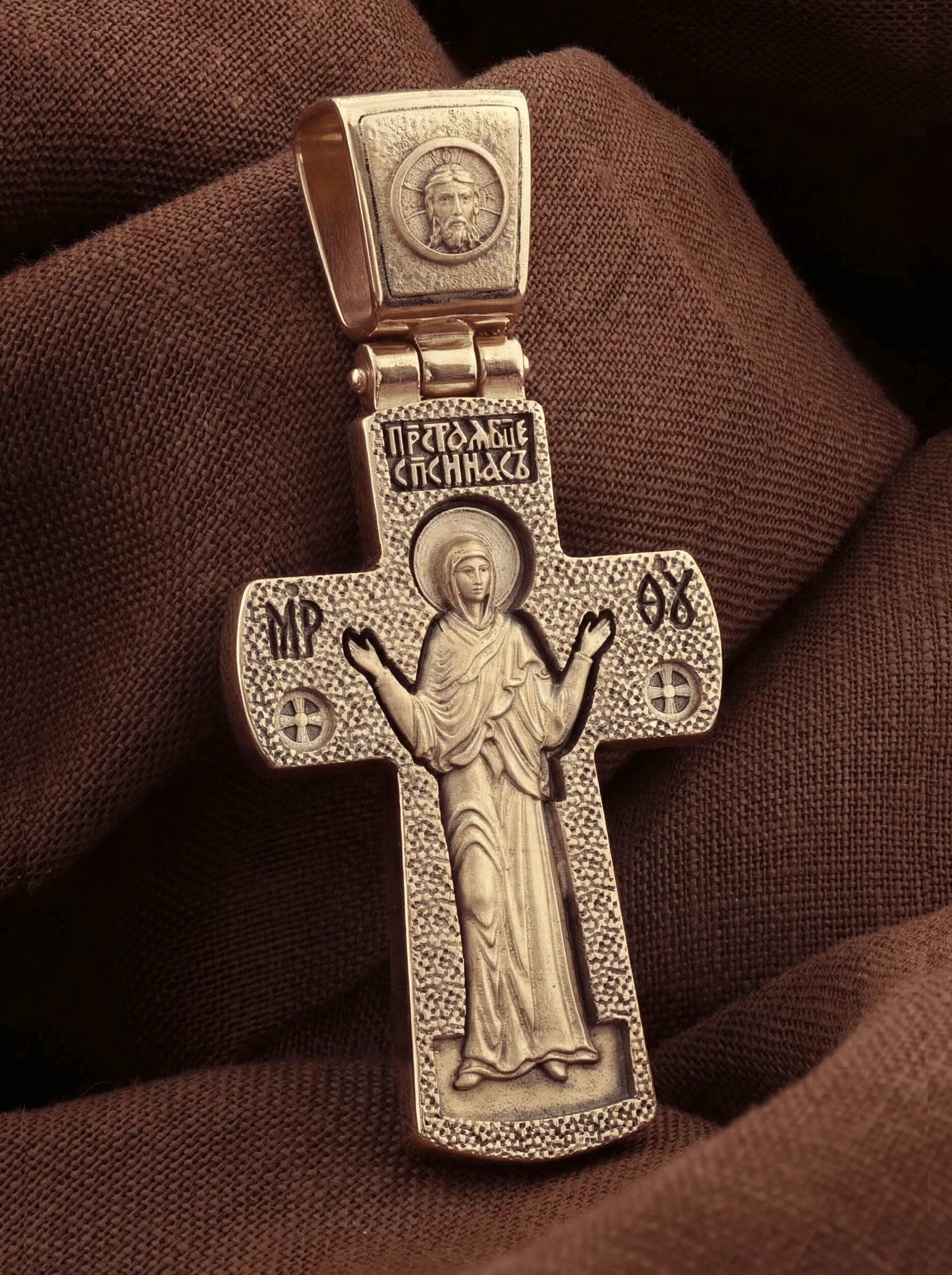 На лицевой стороне креста изображено Распятие Иисуса Христа. Господь представлен свободно покоящимся на кресте с простертыми руками и как бы обнимающим всю Вселенную. Он — Спаситель, искупивший грехи мира, «поправший смертию смерть» и призывающий к Себе «все концы земли». Верхняя перекладина символизирует титло — табличку, на которой, согласно Евангелию, было начертано: Иисус Назорей Царь Иудейский (IНЦI). Также Распятие сопровождается надписями, олицетворяющими Христа. Это святое имя Христа «IC» (Иисус) «ХС» (Христос). Возвышение, на котором стоит Крест, символизирует гору Голгофу, на которой произошло Распятие. У подножия пишутся четыре буквы «МЛ» и «РБ» — «Место Лобное» и «Рай Бысть».