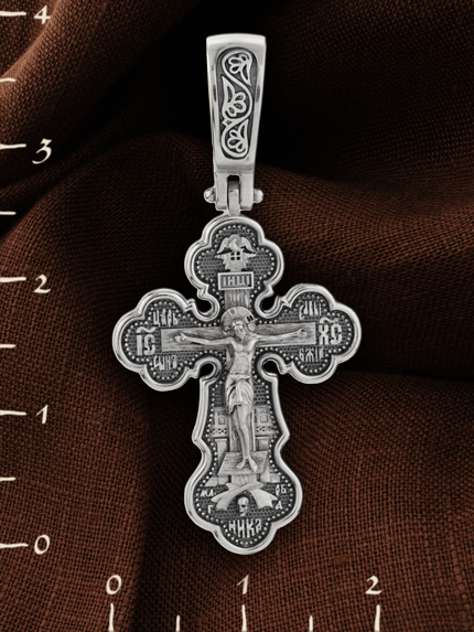 На лицевой стороне креста изображено Распятие Господа и Спасителя нашего Иисуса Христа. Христос, подвергнутый на кресте мучительной казни, своими страданиями искупил нас от древнего греха и даровал нам жизнь вечную. На верхней табличке, выше головы Иисуса, расположена надпись, составленная Понтием Пилатом — «IНЦI». Она означает «Иисус Назорей, Царь Иудейский». Распятие сопровождается каноническими надписями. Надпись «IС ХС» означает Иисус Христос, надпись «Царь Славы» и словосочетание «СЫН БОЖИЙ», что означает божественную природу Иисуса Христа, помещаются на разных сторонах поперечной перекладины креста. В нижней части креста находятся надписи –«НИКА» и «МЛРБ». В переводе с греческого, слово «НИКА» означает «победитель». Именно оно является символом победы Христа над смертью. Надпись «МЛРБ» — «место лобное рай бысть» означает, что место лобное стало раем. Крест стоит на горе камней, символизирующих Голгофу. Под подножием Креста изображена покоящаяся голова (череп) Адама и надпись «Г.А.». Христос в Своей Божественной любви, над которой смерть не властна и которая, страдая, и не страдает в обычном смысле, простирает к людям со Креста Свои объятия, в которые призывается и привлекается весь мир. Поэтому Тело Его не висит, а торжественно покоится на Кресте.