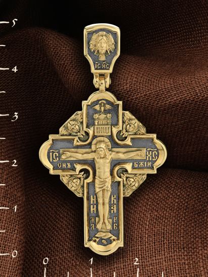 На лицевой стороне креста изображено Распятие Господа и Спасителя нашего Иисуса Христа, отдавшего Себя на смерть, чтобы другие могли жить — жить вечной жизнью, жить с Богом. Своею кровью Господь освятил крест и сделал его проводником Своей благодати, источником освящения верующих. На верхней табличке, выше головы Иисуса, расположена надпись, составленная Понтием Пилатом — «ИНЦИ». Она означает «Иисус Назорей, Царь Иудейский». Надпись «IС ХС» означает Иисус Христос помещается на разных сторонах поперечной (большой) перекладины креста. На кулонном кольце помещено изображение Духа Святого в виде голубя, сходящего с Небес
