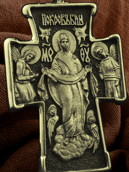 На обороте креста изображена икона Покрова Пресвятой Богородицы. Праздник Покрова Божией Матери является воспоминанием чуда, которое произошло во Влахнернской церкви 1 (14) октября 910 года: Пресвятая Богородица явилась верующим над алтарем храма и распростерла над ними Свое покрывало. В этот день Божия Матерь открыла людям, что Она является Ходатаицей за них перед Богом. Богородица простирает Свой молитвенный покров над всеми православными христианами и умоляет Сына Своего о даровании вечного спасения каждому человеку.
