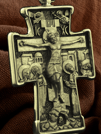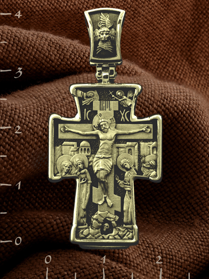 На лицевой стороне креста изображено Распятие Господа Иисуса Христа с предстоящими Ему святыми, которые, по преданию, находились у Креста Господа во время Его казни. Слева — Пресвятая Богородица и равноапостольная Мария Магдалина, справа — апостол Иоанн Богослов и мученик Лонгин Сотник. Верхняя перекладина креста символизирует титло — табличку, на которой, согласно Евангелию, было начертано: «Иисус Назорей Царь Иудейский» (IНЦI). Над перекладиной пишется сокращенно имя Спасителя «IC XC» — Иисус Христос. Возвышение, на котором стоит Крест, символизирует гору Голгофу, на которой произошло Распятие. У подножия Креста изображают прах Адама, обозначенный черепом.