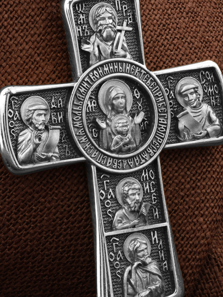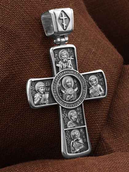 Центральную часть оборота креста украшает икона Божией Матери «Знамение». Вокруг Ее образа написана молитва: «Ныне к Тебе прибегаю, Пресвятая Дева, спаси мя мольбами Твоими».