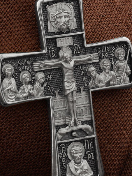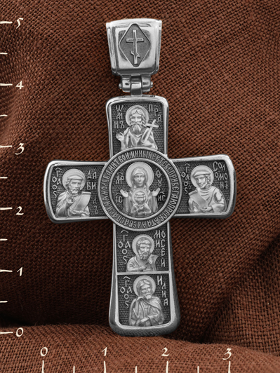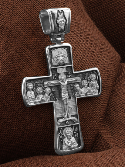 На лицевой стороне креста изображено Распятие Господа Иисуса Христа с предстоящими Ему святыми, которые, по преданию, находились у Креста Господа во время Его казни. Слева — Пресвятая Богородица и жены-мироносицы — равноапостольная Мария Магдалина и святая Мария Клеопова, справа — апостол Иоанн Богослов, прав. Иосиф Аримофейский и мч. Лонгин Сотник.