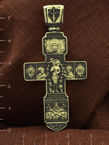 На концах горизонтальной балки креста помещены образы вселенских святителей и творцов литургии Василия Великого и Иоанна Златоуста. В кулонном кольце изображены райские врата с их стражем — Херувимом. Врата, которые открылись благодаря крестной жертве Христа.
