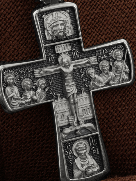 На лицевой стороне креста изображено Распятие Господа Иисуса Христа с предстоящими Ему святыми, которые, по преданию, находились у Креста Господа во время Его казни. Слева — Пресвятая Богородица и жены-мироносицы — равноапостольная Мария Магдалина и святая Мария Клеопова, справа — апостол Иоанн Богослов, прав. Иосиф Аримофейский и мч. Лонгин Сотник.